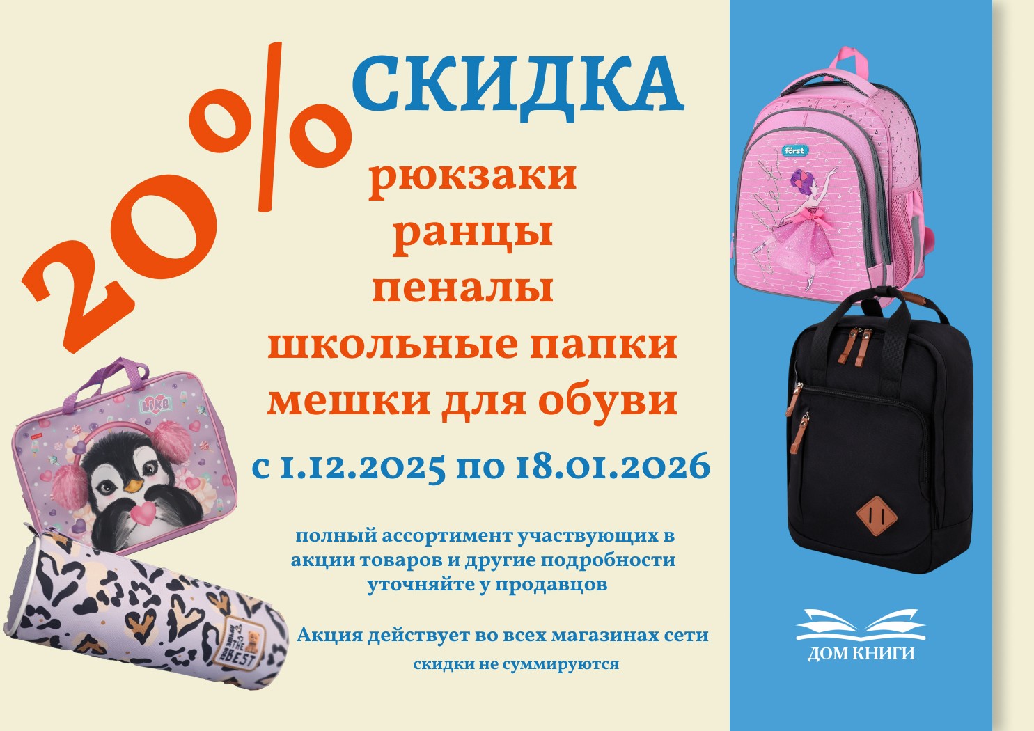 Скидка 20% на рюкзаки, ранцы, пеналы, школьные папки и мешки для обуви