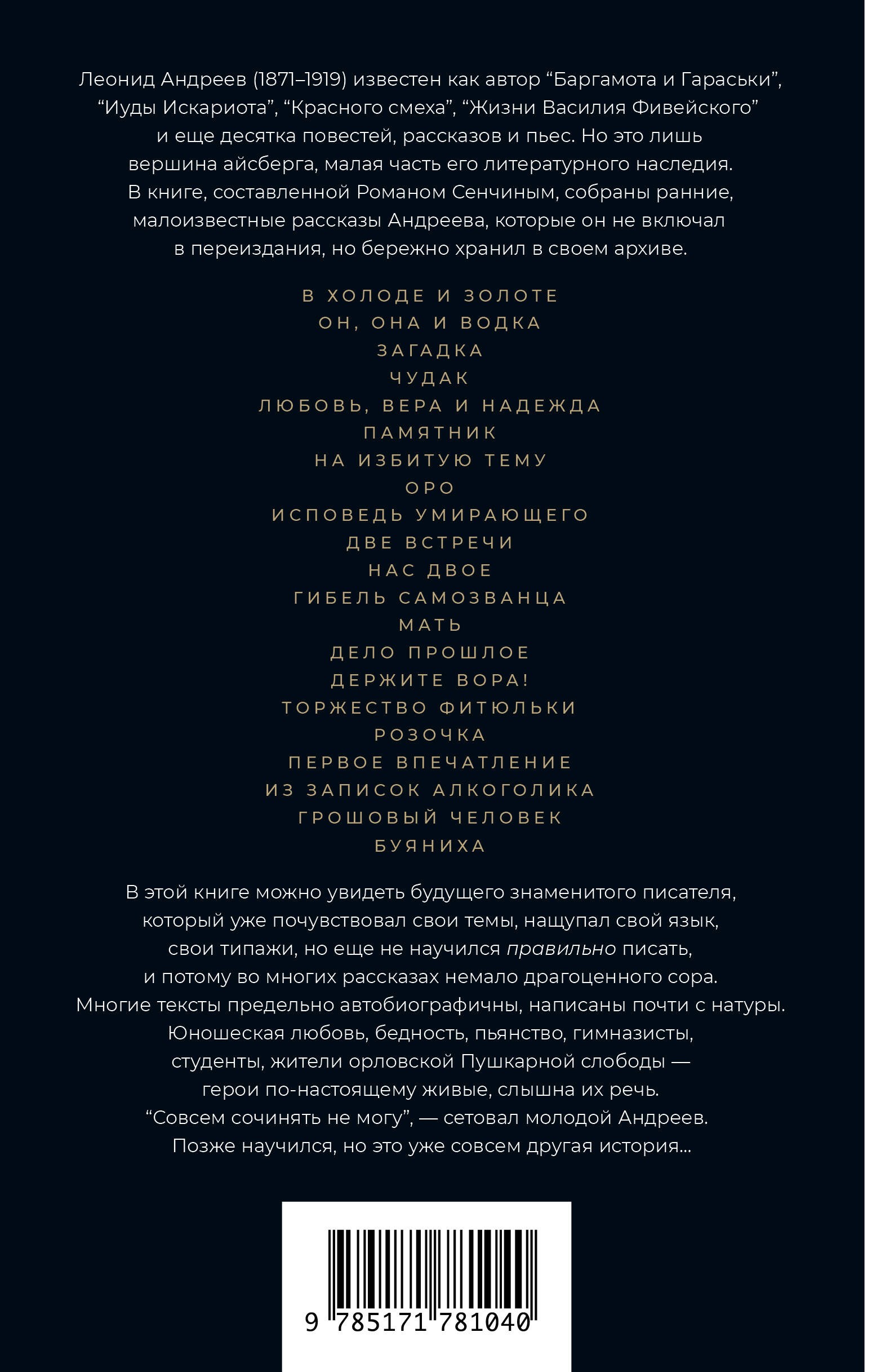– Сборник ранних рассказов и повестей, которые сам Леонид Андреев не включал в прижизненные издания; их нет и в собрании сочинений 1990-х годов.– Леонид Андреев мечтал стать писателем с юных лет. В девятнадцать он записал в дневнике: «…Я хочу в своей книге подействовать на разум, на чувства, на нервы человека, на всю его животную природу. Я хотел бы, чтоб человек бледнел от ужаса, читая мою книгу, чтоб она действовала на него как дурман, как страшный сон, чтоб она сводила людей с ума, чтоб они проклинали, ненавидели меня, но все-таки читали ее…»– В издание вошли рассказы «Загадка», «Чудак», стихотворение в прозе «Две встречи» и другие ранние произведения Андреева. Благодаря этой книге знакомый и любимый автор «Кусаки», «Ангелочка», «Жизни Василия Фивейского», «Иуды Искариота» предстанет перед читателем с новой стороны.– Составитель сборника — Роман Сенчин, лауреат премий «Большая книга» и «Ясная Поляна».– Серия «Предметы культа». Читайте также: «Венедикт Ерофеев. Поэт с топором» Михаила Бутова, «Анна Ахматова. Жизнь без вранья» Лидии Чуковской, «Сергей Довлатов. Наш человек в Америке» Александра Гениса.