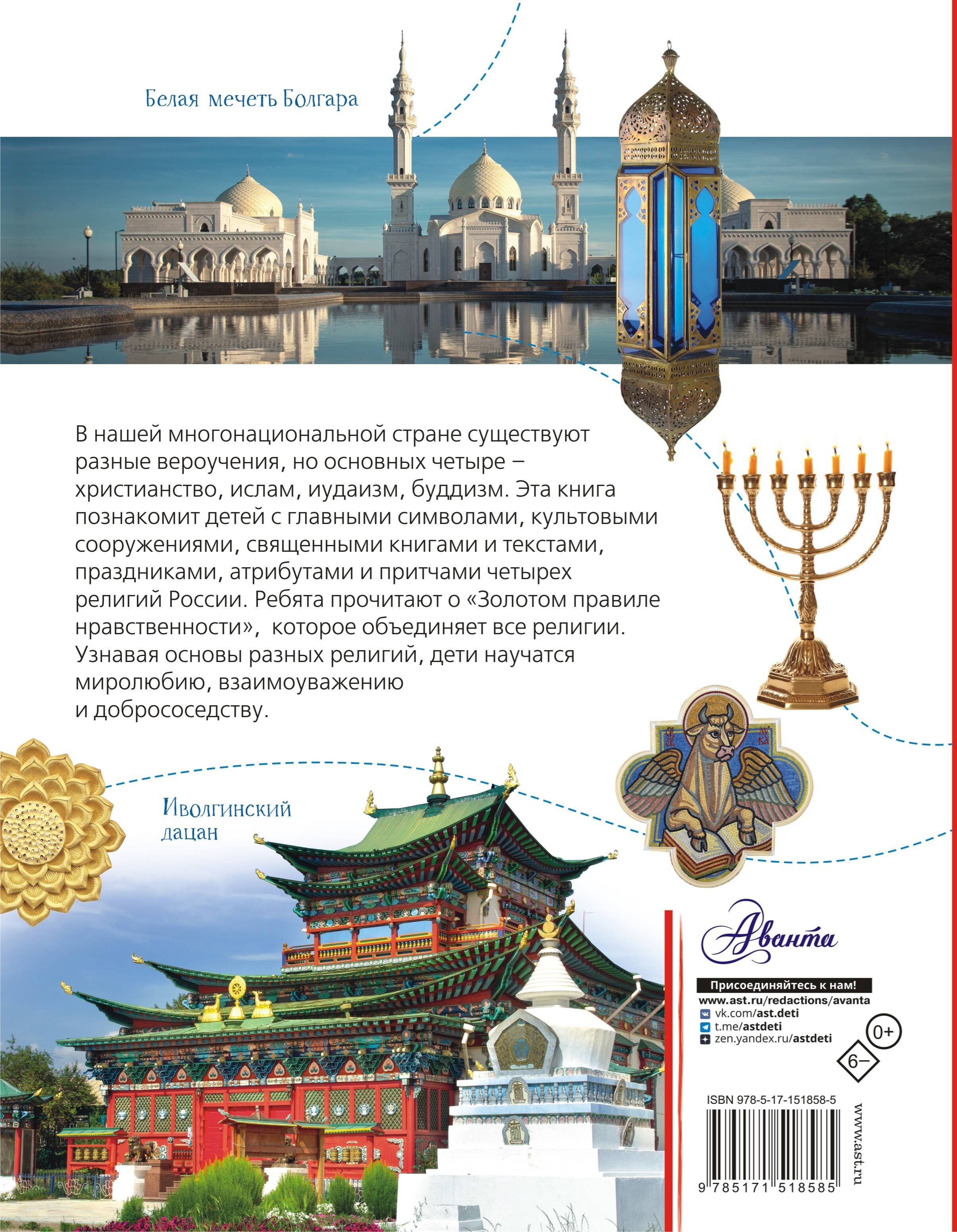 В нашей многонациональной стране существуют разные вероучения, но самых больших религиозных направлений четыре – христианство, ислам, иудаизм, буддизм. Эта книга познакомит детей с их главными символами, культовыми сооружениями, священными книгами и текстами, праздниками, атрибутами и притчами. Ребята узнают, как каждая из религий относится к порокам и добродетелям, отношению к людям, прочитают о «Золотом правиле нравственности», которое объединяет все религии. Узнавая основы разных религий, дети научатся миролюбию, взаимоуважению и добрососедству.Книга поможет детям легче освоить школьный предмет "Основы религиозных культур и светской этики".