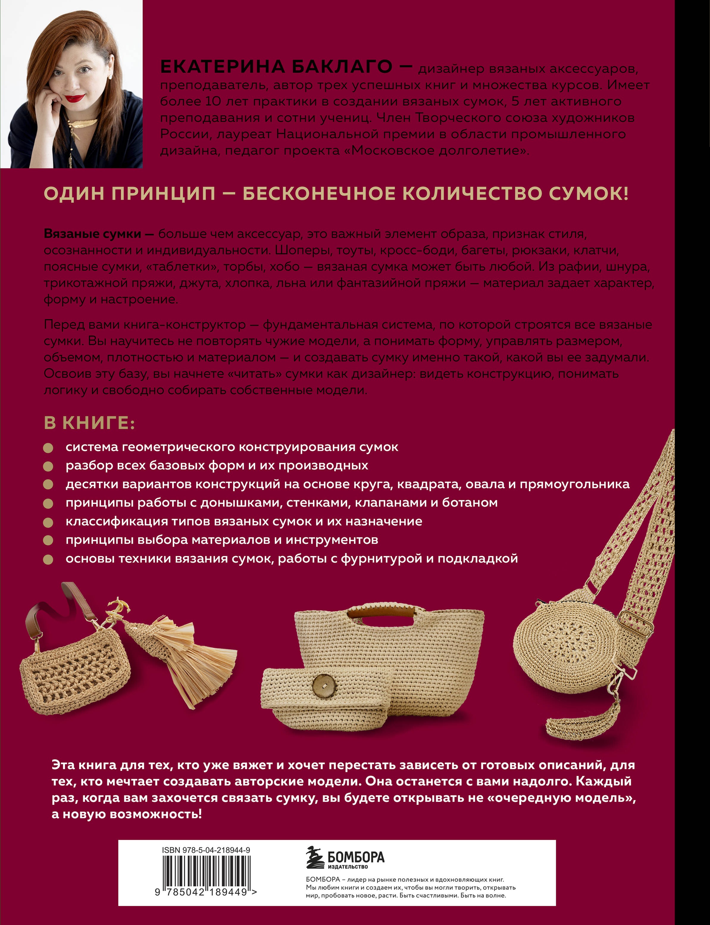 Одна книга — тысячи идей. Один принцип — бесконечное количество сумок.Вязаные сумки сегодня — это больше, чем модный тренд. Это способ выразить стиль, характер и индивидуальность. Они легко вписываются в городской или отпускной гардероб, становятся акцентом образа или его основой, переходят из повседневного формата в вечерний и обратно.Шопперы и тоуты, кросс-боди и багеты, рюкзаки, клатчи, поясные сумки, «таблетки» и торбы — вязаная сумка может быть любой. Жесткой или мягкой. Лаконичной или декоративной. Из рафии, шнура, трикотажной пряжи, джута, хлопка или льна. Но за всем этим разнообразием всегда стоит одно — понятная конструкция.Перед вами не сборник мастер-классов и не каталог готовых моделей. Это книга-конструктор, созданная для тех, кто хочет не повторять, а создавать и моделировать.Екатерина Баклаго предлагает системный подход к вязанию сумок: через геометрию формы, логику конструкции и понимание материала.Любая, даже самая сложная сумка, разбирается на простые элементы — круг, квадрат, овал, прямоугольник. Освоив эту базу, вы сможете собирать собственные модели — нужного размера, формы и плотности, из той пряжи, которая есть именно у вас.Это книга о свободе творчества и уверенности в результате.Почему эта система работает?Методика основана на более чем 10-летнем опыте автора в дизайне вязаных сумок и преподавании. Она рождалась на живых уроках, в диалоге с ученицами, из сотен вопросов: как изменить размер, как выбрать материал, как придумать форму и не ошибиться.Здесь нет случайных решений — только выверенные принципы, которые помогают избежать типичных ошибок и получать предсказуемый, красивый результат.Что вы найдете в книге:- систему геометрического конструирования вязаных сумок;- разбор всех базовых форм и вариантов их сочетаний;- конструкции донышек, стенок, клапанов и ботана;- классификацию типов сумок и их назначение;- осознанный выбор материалов: рафия, шнур, трикотажная пряжа, джут, хлопок, лен;- выбор инструментов и технику вязания, правила чтения схем;- обзор фурнитуры, технологию работы с подкладкой и даже основы брендирования.Эта книга:- Для тех, кто мечтает бесконечно дополнять свой гардероб стильными аксессуарами.- Для тех, кто уже имеет опыт вязания и кому тесно в рамках готовых описаний.- Для мастеров, которые хотят создавать авторские модели, понимать логику формы и чувствовать уверенность в каждом этапе работы.- Для тех, кто мечтает собрать собственную коллекцию сумок, а не остановиться на одной модели.Вы перестанете бояться экспериментов, начнете понимать принципы конструкции сумок, сможете создавать модели под свои задачи, стиль и материал — снова и снова.Эта книга не заканчивается на последней странице. Она остается с вами как инструмент, к которому вы будете возвращаться каждый раз, когда в руки попадает крючок и появляется новая идея.Один конструктор — бесконечный полет фантазии.