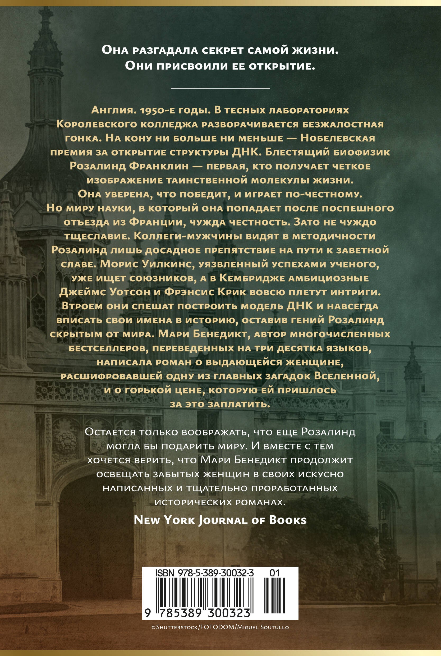 От автора бестселлеров The New York Times Мари Бенедикт, чьи книги переведены на три десятка языков, — исторический роман о судьбе удивительной Розалинд Франклин, стоявшей за одним из величайших открытий XX века, и о том, как ее имя было несправедливо забыто.Англия. 1950-е годы. В тесных лабораториях Королевского колледжа разворачивается безжалостная гонка. На кону ни больше ни меньше — Нобелевская премия за открытие структуры ДНК. Блестящий биофизик Розалинд Франклин — первая, кто получает четкое изображение таинственной молекулы жизни. Она уверена, что победит, и играет по-честному. Но миру науки, в который она попадает после поспешного отъезда из Франции, чужда честность. Зато не чуждо тщеславие. Коллеги-мужчины видят в методичности Розалинд лишь досадное препятствие на пути к заветной славе. Морис Уилкинс, уязвленный успехами ученого, уже ищет союзников, а в Кембридже амбициозные Джеймс Уотсон и Фрэнсис Крик вовсю плетут интриги. Втроем они спешат построить модель ДНК и навсегда вписать свои имена в историю, оставив гений Розалинд скрытым от мира. Мари Бенедикт, автор многочисленных бестселлеров, переведенных на три десятка языков, написала роман о выдающейся женщине, расшифровавшей одну из главных загадок Вселенной, и о горькой цене, которую ей пришлось за это заплатить.Стильное оформление, мягкий переплет с клапанами — идеальный выбор для поклонников «Уроков химии» и «Скрытых фигур», а также любителей историй о сильных женщинах, бросивших вызов всему миру.