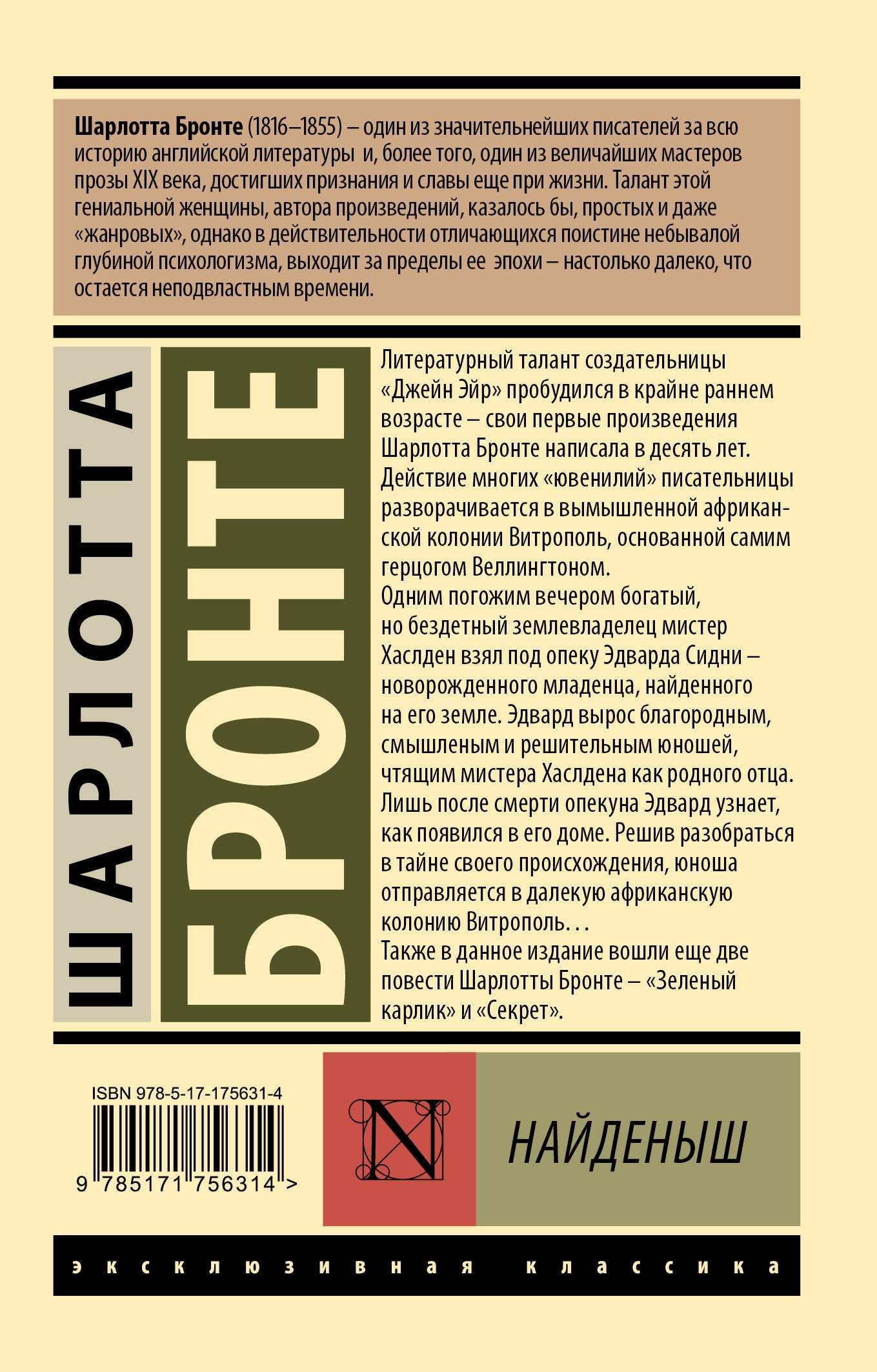 — Шарлотта Бронте — одна из самых известных английских писательниц, автор знаменитого романа «Джейн Эйр».— Вошедшие в данный сборник повести «Найденыш», «Зеленый карлик» и «Секрет» относятся к числу так называемых «ювенилий» — произведений, написанных Бронте в крайне юном возрасте.— Действие большинства ювенилий Шарлотты Бронте разворачивается в вымышленном мире, придуманном Шарлоттой совместно с сестрами Эмили и Энн и братом Бренуэллом.— Издание в серии «Эксклюзивная классика» — в удобном карманном формате и узнаваемом оформлении.