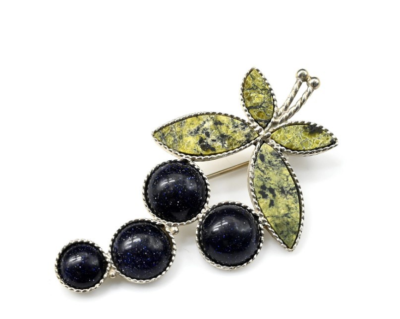 Брошь из змеевика и авантюрина син. Черемуха кк117045