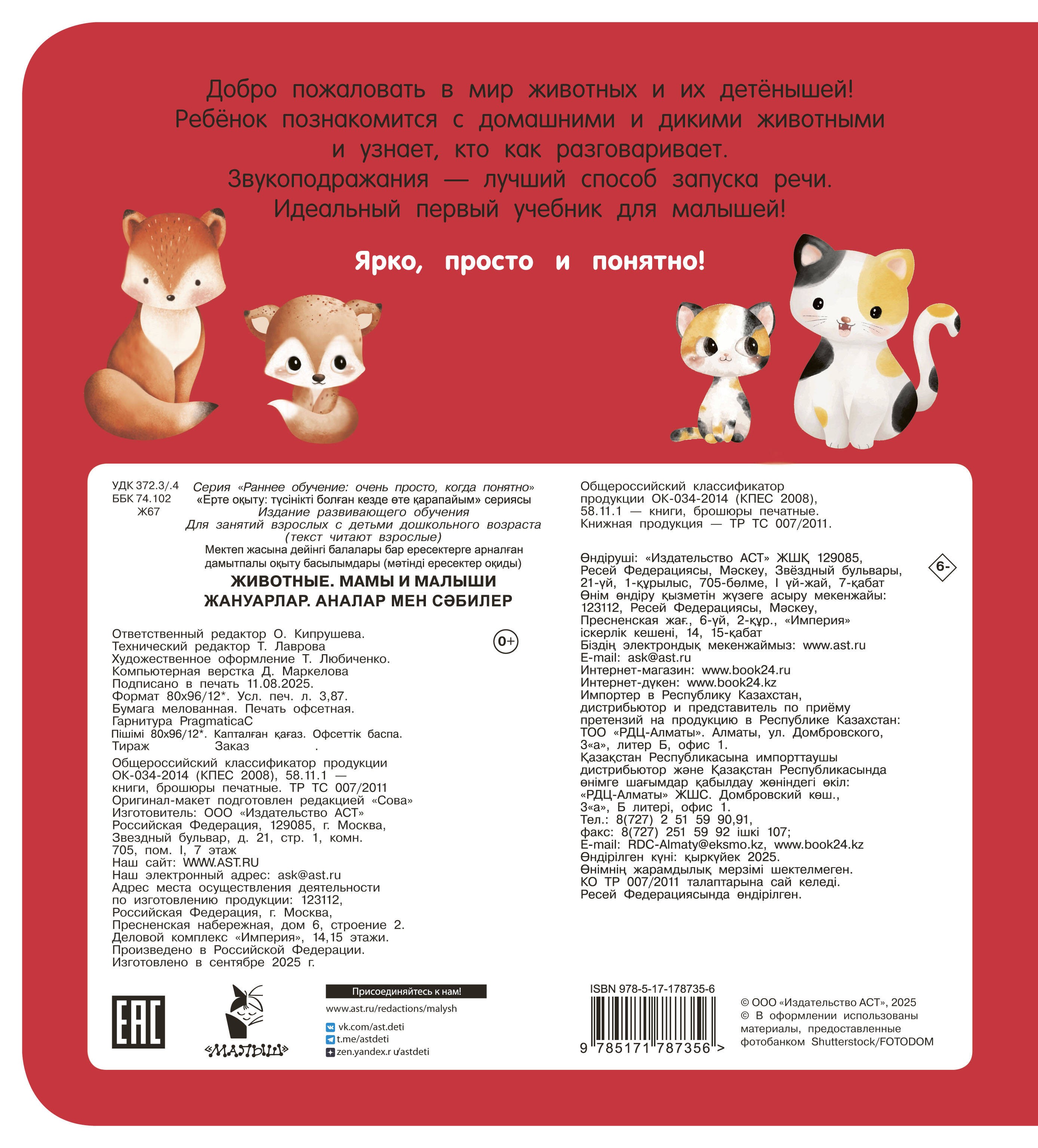 «Животные. Мамы и малыши» — отличный старт для запуска речи!На страницах книги дети рассмотрят красочные иллюстрации и получат представление о том, какие звуки издают животные: кто мычит, кто мяукает, кто гавкает и так далее.• Звукоподражания — лучший способ запуска речи.• Малыш пополнит активный и пассивный словарный запас.• Благодаря ярким картинкам первые уроки превращаются в интересную игру.• Весь материал подобран с учётом особенностей психоэмоциональных и физических особенностей детей раннего возраста.Маленькие читатели с удовольствием будут возвращаться к книге снова и снова. А родители смогут использовать её как наглядное пособие для развивающих занятий. Качественная мелованная бумага и закруглённые углы страниц делают книжку прочной и безопасной — она не порвётся и не помнётся, а ребёнок не порежется!Идеальный подарок ребёнку для первых шагов в обучении — просто, наглядно и красочно!