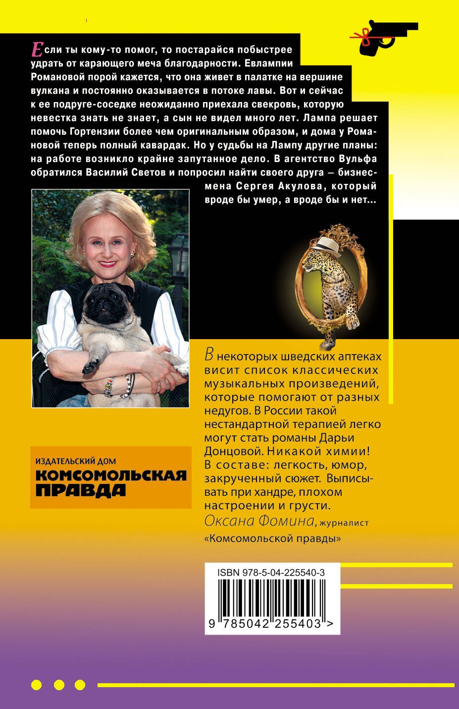 Если ты кому-то помог, то постарайся побыстрее удрать от карающего меча благодарности. Евлампии Романовой порой кажется, что она живет в палатке на вершине вулкана и постоянно оказывается в потоке лавы. Вот и сейчас к ее подруге-соседке неожиданно приехала свекровь, которую невестка знать не знает, а сын не видел много лет. Лампа решает помочь Гортензии более чем оригинальным образом, и дома у Романовой теперь полный кавардак. Но у судьбы на Лампу другие планы: на работе возникло крайне запутанное дело. В агентство Вульфа обратился Василий Светов и попросил найти своего друга — бизнесмена Сергея Акулова, который вроде бы умер, а вроде бы и нет…Дарья Донцова — самый популярный и востребованный автор в нашей стране, любимица миллионов читателей. В России продано более 200 миллионов экземпляров ее книг.Ее творчество наполняет сердца и души светом, оптимизмом, радостью, уверенностью в завтрашнем дне!«Донцова невероятная работяга! Я не знаю ни одного другого писателя, который столько работал бы. Я отношусь к ней с уважением, как к образцу писательского трудолюбия. Женщины нуждаются в психологической поддержке и получают ее от Донцовой. Я и сама в свое время прочла несколько романов Донцовой. Ее читают очень разные люди. И очень занятые бизнес-леди, чтобы на время выключить голову, и домохозяйки, у которых есть перерыв 15—20 минут между отвести-забрать детей». — Галина Юзефович, литературный критик