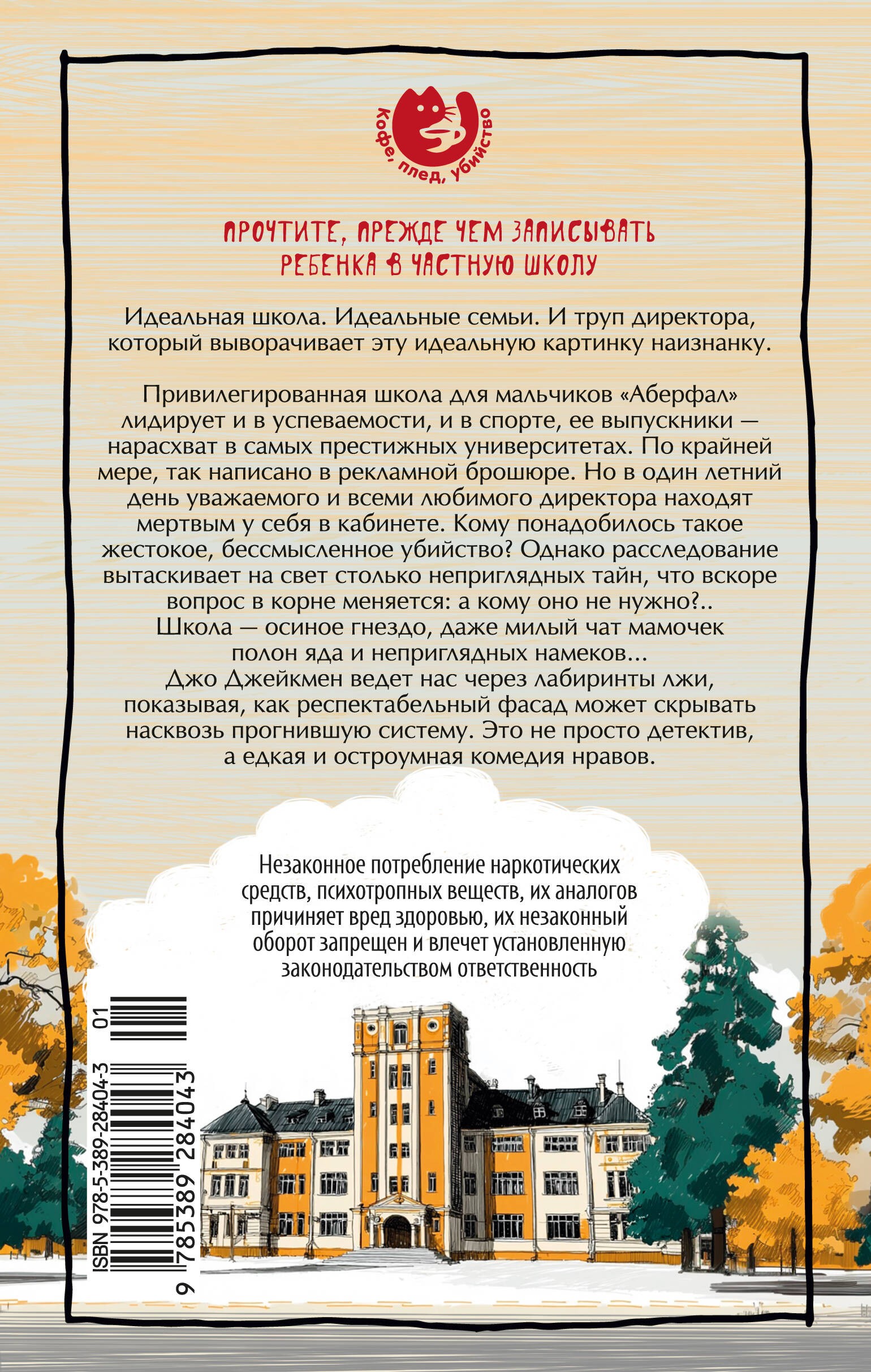 НЕЗАКОННОЕ ПОТРЕБЛЕНИЕ НАРКОТИЧЕСКИХ СРЕДСТВ, ПСИХОТРОПНЫХ ВЕЩЕСТВ, ИХ АНАЛОГОВ ПРИЧИНЯЕТ ВРЕД ЗДОРОВЬЮ, ИХ НЕЗАКОННЫЙ ОБОРОТ ЗАПРЕЩЕН И ВЛЕЧЕТ УСТАНОВЛЕННУЮ ЗАКОНОДАТЕЛЬСТВОМ ОТВЕТСТВЕННОСТЬ.Идеальная школа. Идеальные семьи. И труп директора, который выворачивает эту идеальную картинку наизнанку .Привилегированная школа для мальчиков «Аберфал» лидирует и в успеваемости, и в спорте, ее выпускники — нарасхват в самых престижных университетах. По крайней мере, так написано в рекламной брошюре. Но в один летний день уважаемого и всеми любимого директора находят мертвым у себя в кабинете. Кому понадобилось такое жестокое, бессмысленное убийство? Однако расследование вытаскивает на свет столько неприглядных тайн, что вскоре вопрос в корне меняется: а кому оно не нужно ?.. Школа — осиное гнездо, даже милый чат мамочек полон яда и неприглядных намеков…Джо Джейкман ведет нас через лабиринты лжи, показывая, как респектабельный фасад может скрывать насквозь прогнившую систему. Это не просто детектив, а едкая и остроумная комедия нравов.Если вам нравятся умные триллеры с живыми персонажами, если вы цените черный юмор и сатиру на современное общество — эта книга для вас. Идеальный выбор для поклонников жанра, любящих истории, где всем есть что скрывать, и все под подозрением.