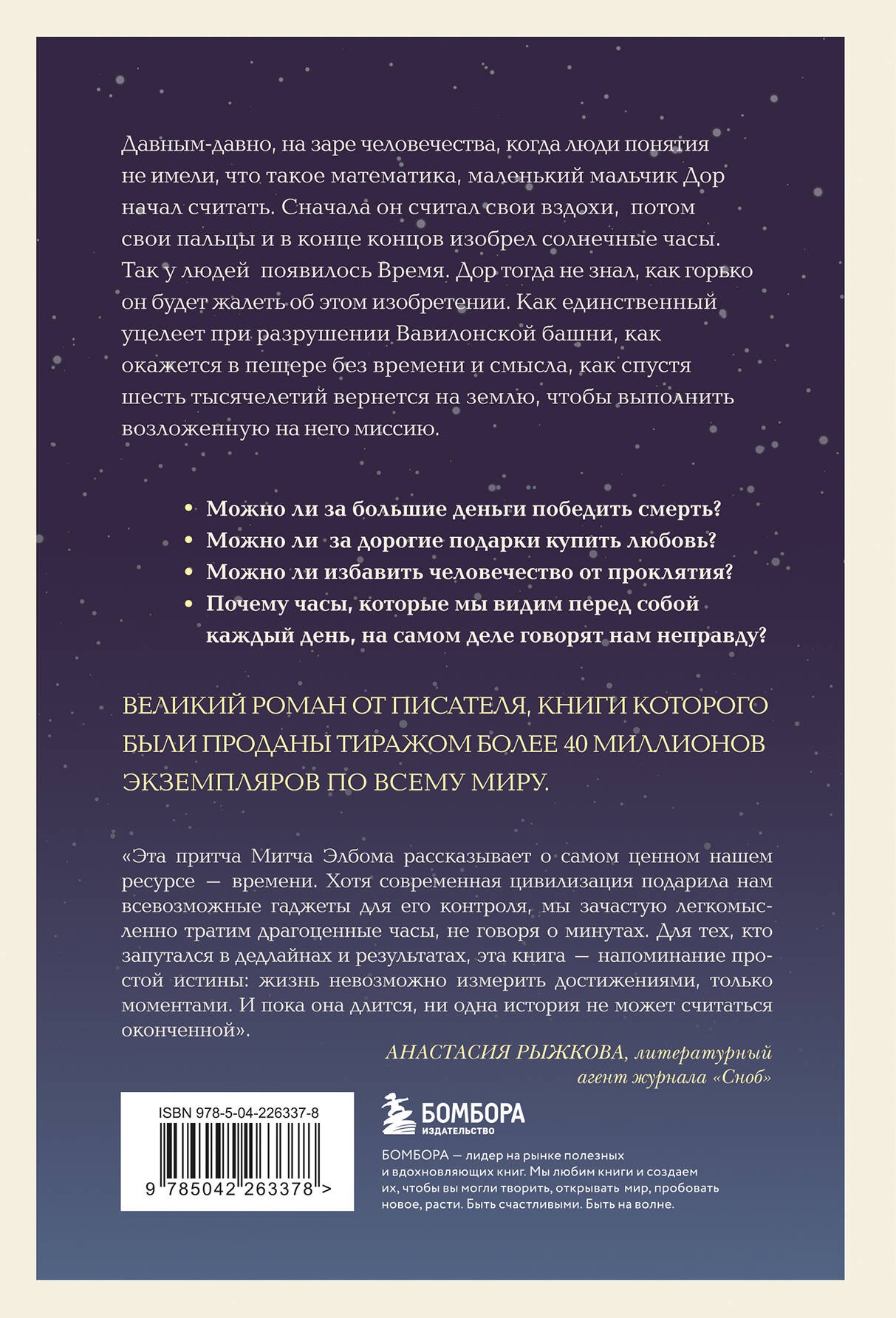 Давным-давно, на заре человечества, когда люди понятия не имели, что такое математика, маленький мальчик Дор начал считать. Сначала он считал свои вздохи, потом свои пальцы, и в конце концов изобрел солнечные часы. Так у людей появилось Время. Дор тогда не знал, как горько он будет жалеть об этом изобретении. Как единственный уцелеет при разрушении Вавилонской башни, как окажется в пещере без времени и смысла, как спустя шесть тысячелетий вернется на Землю, чтобы выполнить возложенную на него миссию. Дору предстоит познакомиться со старшеклассницей Сарой Лемон и 82-летним миллионером Виктором Деламонтом, которым предначертано узнать секреты Времени, постичь тайны бессмертия и осознать, для чего же человеческая жизнь имеет свое начало и конец.Можно ли за большие деньги победить смерть?Можно ли за дорогие подарки купить любовь?Можно ли избавить человечество от проклятия?Почему часы, которые мы видим перед собой каждый день, на самом деле говорят нам неправду?Великий роман от писателя, книги которого были проданы тиражом более 40 миллионов экземпляров по всему миру.«Эта притча Митча Элбома рассказывает о самом ценном нашем ресурсе — времени. Хотя современная цивилизация подарила нам всевозможные гаджеты для его контроля, мы зачастую легкомысленно тратим драгоценные часы, не говоря о минутах. Для тех, кто запутался в дедлайнах и результатах, эта книга — напоминание простой истины: жизнь невозможно измерить достижениями, только моментами. И пока она длится, ни одна история не может считаться оконченной». — Анастасия Рыжкова, литературный агент snob
