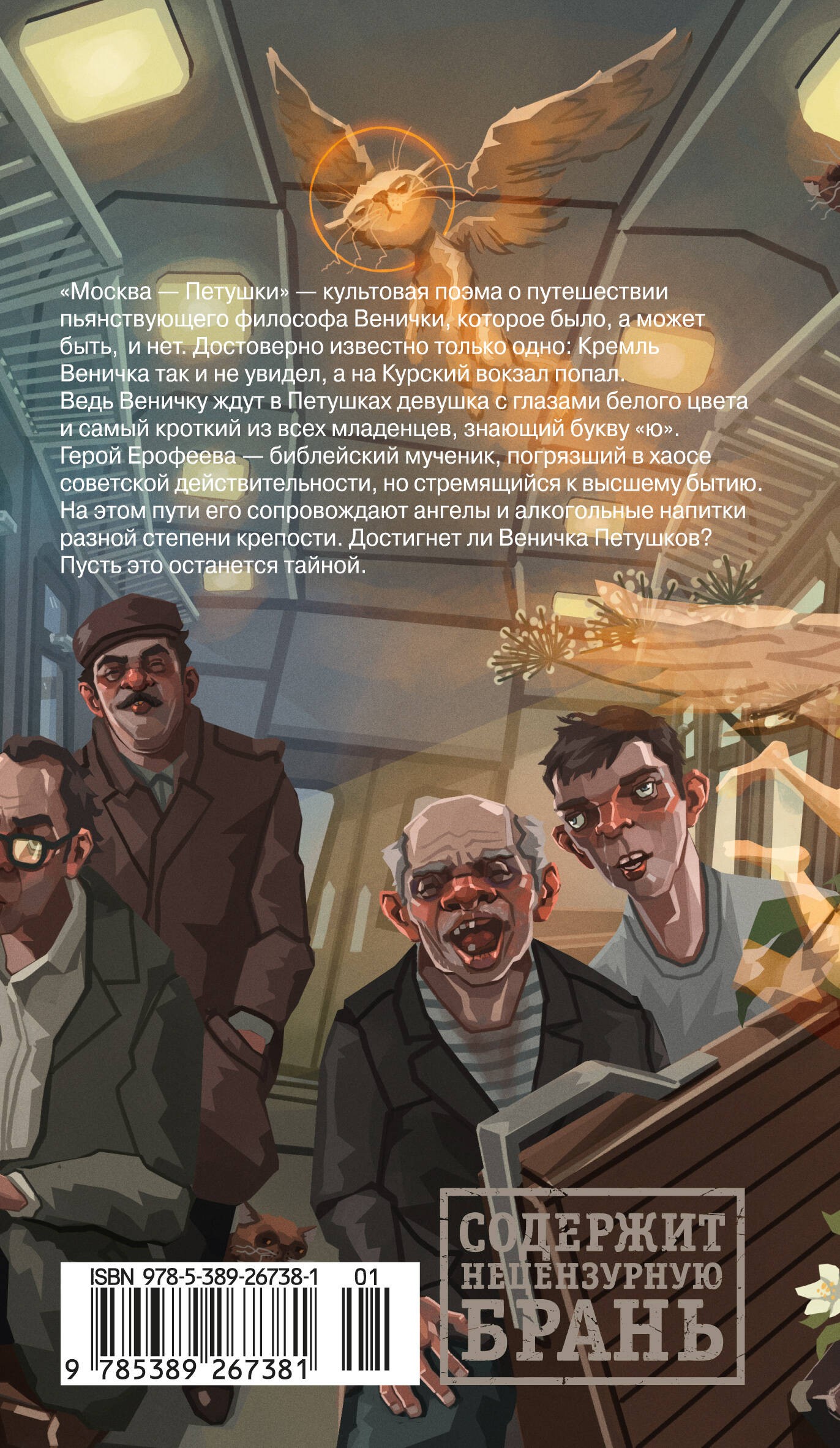 Современная классика в новом дерзком оформленииТекст, ставший символом андеграундной литературы СССРКнига выдержала множество переизданийПереведена на множество языков«Москва-Петушки» – культовая поэма о путешествии пьянствующего философа Венички, которое было, а, может быть, и нет. Достоверно известно только одно: Кремль Веничка так и не увидел, а на Курский вокзал попал. Ведь Веничку ждут в Петушках девушка с глазами белого цвета и самый кроткий из всех младенцев, знающий букву «ю». Герой Ерофеева – библейский мученик, погрязший в хаосе советской действительности, но стремящийся к высшей жизни. На этом пути его сопровождают ангелы и алкогольные напитки разной степени крепости. Достигнет ли Веничка Петушков? Пусть это останется тайной.Поэма «Москва-Петушки» была написана в 1969 году, впервые опубликована в России в 1988-1989 гг. в журнале «Трезвость и культура». С тех пор поэма издавалась неоднократно и была переведена на многие языки.Венедикт Ерофеев — писатель и драматург, автор гениальной поэмы «Москва-Петушки» (1970) и пьесы «Вальпургиева ночь» (1985) — явление в русской литературе огромное и еще не до конца осмысленное. В краткой автобиографии своим «первым заслуживающим внимания сочинением» Ерофеев называет «Записки психопата» (1956–1958), начатые в семнадцатилетнем возрасте, «самое объёмное и нелепое из написанного».