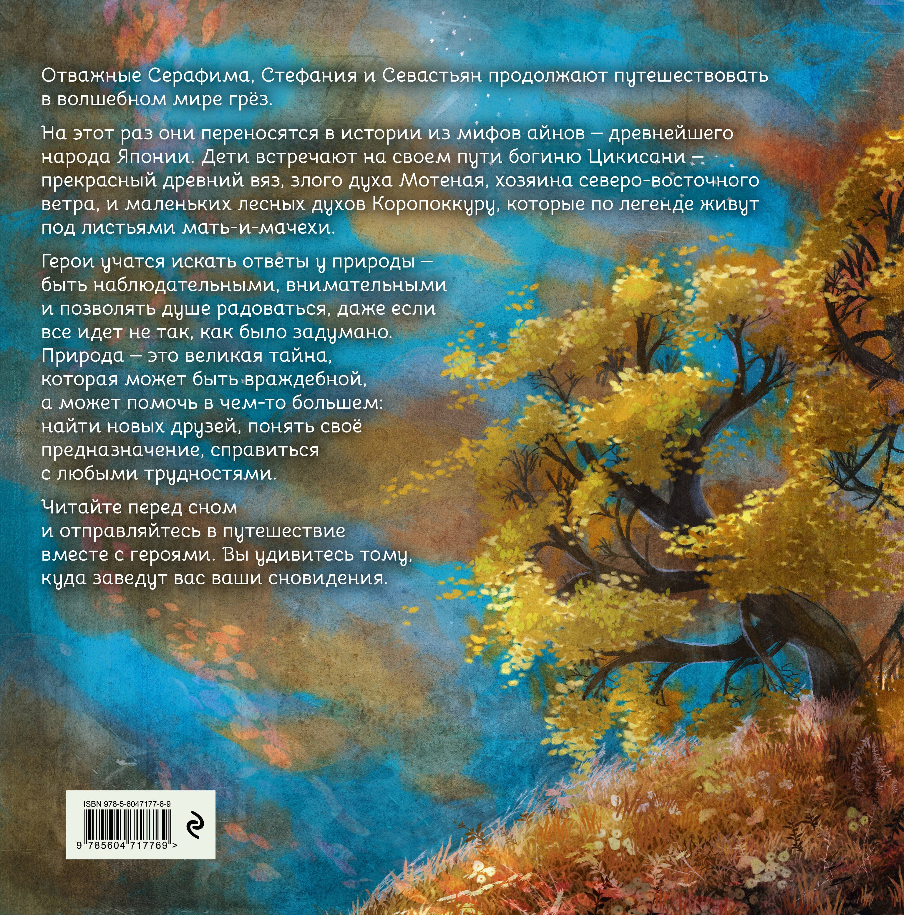 Продолжение приключений девочки-воина, девочки-мечты и мальчика-дракона в волшебном мире грёз.Дети переносятся в истории из мифов айнов — древнейшего народа Японии. Они встречают на своём пути богиню Цикисани — прекрасный древний вяз, злого духа Мотеная, хозяина северо-восточного ветра и маленьких лесных духов Коропоккуру, которые по легенде живут под листьями мать-и-мачехи.Герои учатся искать ответы у природы — быть наблюдательными, внимательными и позволять душе радоваться, даже если всё идёт не так, как было задумано. Природа — это великая тайна, которая может быть враждебной, а может помочь в чём-то большем: найти новых друзей, понять своё предназначение, справиться с любыми трудностями.Красочная книга с удивительными иллюстрациями Ксении Урбан. Для семейного чтения!