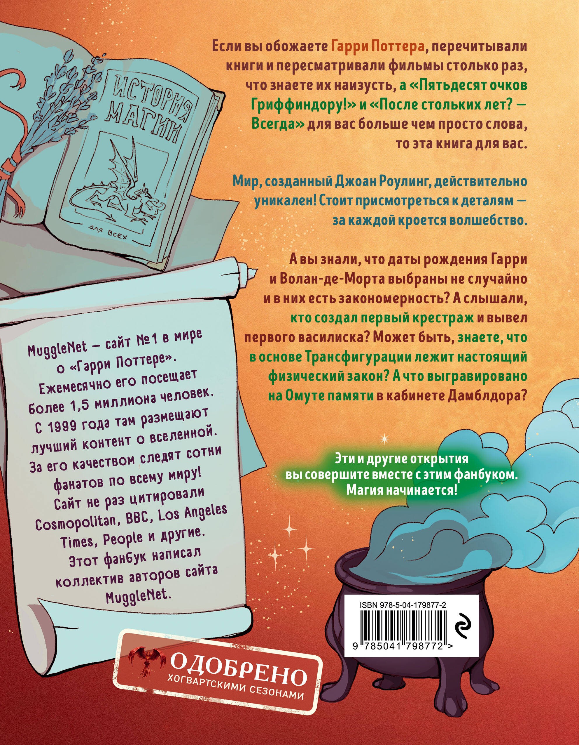 Если ты обожаешь «Гарри Поттера», перечитывал книги и пересматривал фильмы столько раз, что знаешь их наизусть, «Пятьдесят очков Гриффиндору!» и «После стольких лет? — Всегда» для тебя больше чем слова, то это книга станет настоящим подарком и украшением твоей коллекции. Ведь каждый фанат мечтает не расставаться с любимой вселенной и узнавать о ней всё больше и больше.Знаешь ли ты, что даты рождения Гарри и Волан-де-Морта выбраны не случайно и в них есть закономерность? Может быть, слышал, кто создал первый крестраж и вывел первого василиска? А что выгравировано на Омуте памяти в кабинете Дамблдора, догадываешься?В начале книги ты найдёшь письмо-приглашение в Хогвартс, а в конце — диплом об окончании волшебной школы (аккуратно отрежь их по пунктирной линии). Стань настоящим волшебником, а фанбук тебе в этом поможет!Дорогой друг, тебя ждёт множество невероятных открытий, волшебство на каждой странице. Хогвартс-экспресс отправляется с платформы 9 ¾ прямо сейчас!Иллюстрация на обложке ALES.