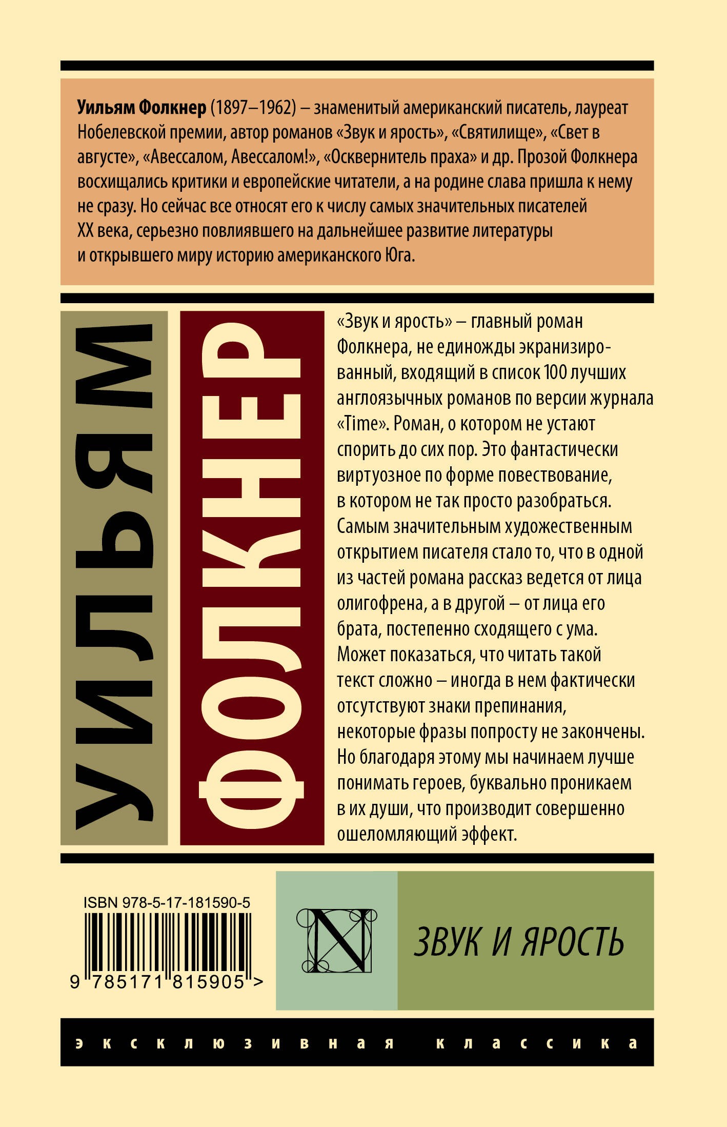 — «Звук и ярость» — главный роман Уильяма Фолкнера.— Уильям Фолкнер — лауреат Нобелевской премии по литературе и один из самых значимых американских писателей первой половины XX века, автор романов «Город», «Святилище» и «Непобежденные».— Роман «Звук и ярость» входит в списки 100 лучших англоязычных романов XX века по версии журнала Time, газеты Le Monde и издательства Modern Library.— Роман неоднократно экранизировался.— Издание в серии «Эксклюзивная классика (Лучшее)» — твердая обложка, качественная бумага, ленточка ляссе и узнаваемое оформление.