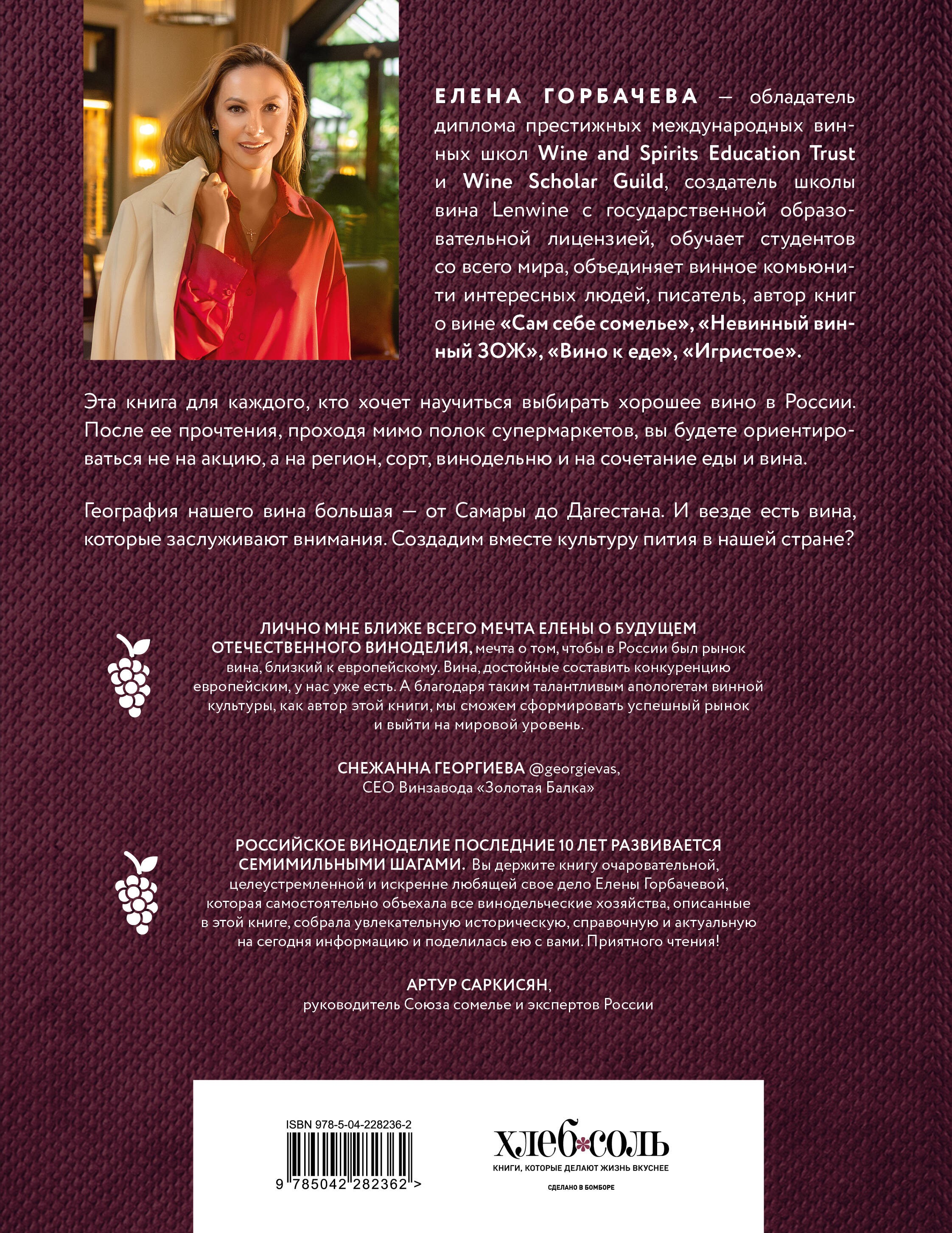 Полностью обновленное издание популярной книги авторитетного винного эксперта Елены Горбачевой написана для каждого, кто хочет научиться выбирать хорошее отечественное вино. Вместе с автором вы посетите лучшие российские винодельни и познакомитесь с людьми, которые создают этот напиток; совершите экскурс в историю отечественного виноделия, откроете для себя новые винодельческие регионы — от Самары до Дербента. Узнаете об особенностях их климата, терруара, почвы и сортов винограда. Каждый, прочитавший эту книгу, поймет и научится оценивать российское вино. Теперь, проходя мимо полок супермаркетов, вы будете ориентироваться не на акцию, а на регион, сорт, винодельню и на сочетание еды и вина. Приятных вам открытий в мире российских вин и вкусных дегустаций!Елена Горбачева — обладатель диплома престижных международных винных школ «Wine and Spirits Education Trust» и «Wine Scholar Guild», создатель школы вина Lenwine c государственной образовательной лицензией, обучает студентов со всего мира, объединяет винное комьюнити интересных людей, писатель, автор книг о вине «Сам себе сомелье», «Невинный винный ЗОЖ», «Вино к еде», «Игристое».