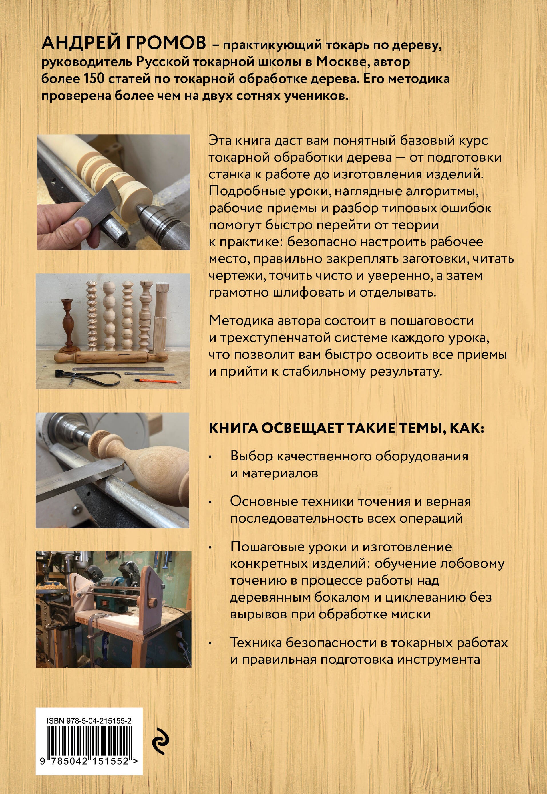 Эта книга — понятный базовый курс по токарной обработке дерева: от подготовки станка к работе до изготовления изделий. Последовательные уроки, наглядные схемы, практические приёмы и разбор типичных ошибок помогут быстро перейти от теории к делу: безопасно организовать рабочее место, надёжно фиксировать заготовки, читать чертежи, выполнять чистый и уверенный рез, а затем грамотно шлифовать и отделывать.Методика автора основана на пошаговом подходе и трёхступенчатой структуре каждого урока, что позволит быстро освоить ключевые приёмы и выйти на стабильный качественный результат.Книга освещает такие темы, как:- Выбор качественного оборудования и материалов.- Основные техники точения и верная последовательность всех операций.- Пошаговые уроки и изготовление конкретных изделий: обучение лобовому точению в процессе работы над деревянным бокалом и циклеванию без вырывов при обработке миски.- Техника безопасности в токарных работах и правильная настройка инструмента.Андрей Громов — практикующий токарь по дереву, руководитель Русской токарной школы в Москве, автор более 150 статей по токарной обработке дерева. Его методика проверена более чем на двух сотнях учеников.