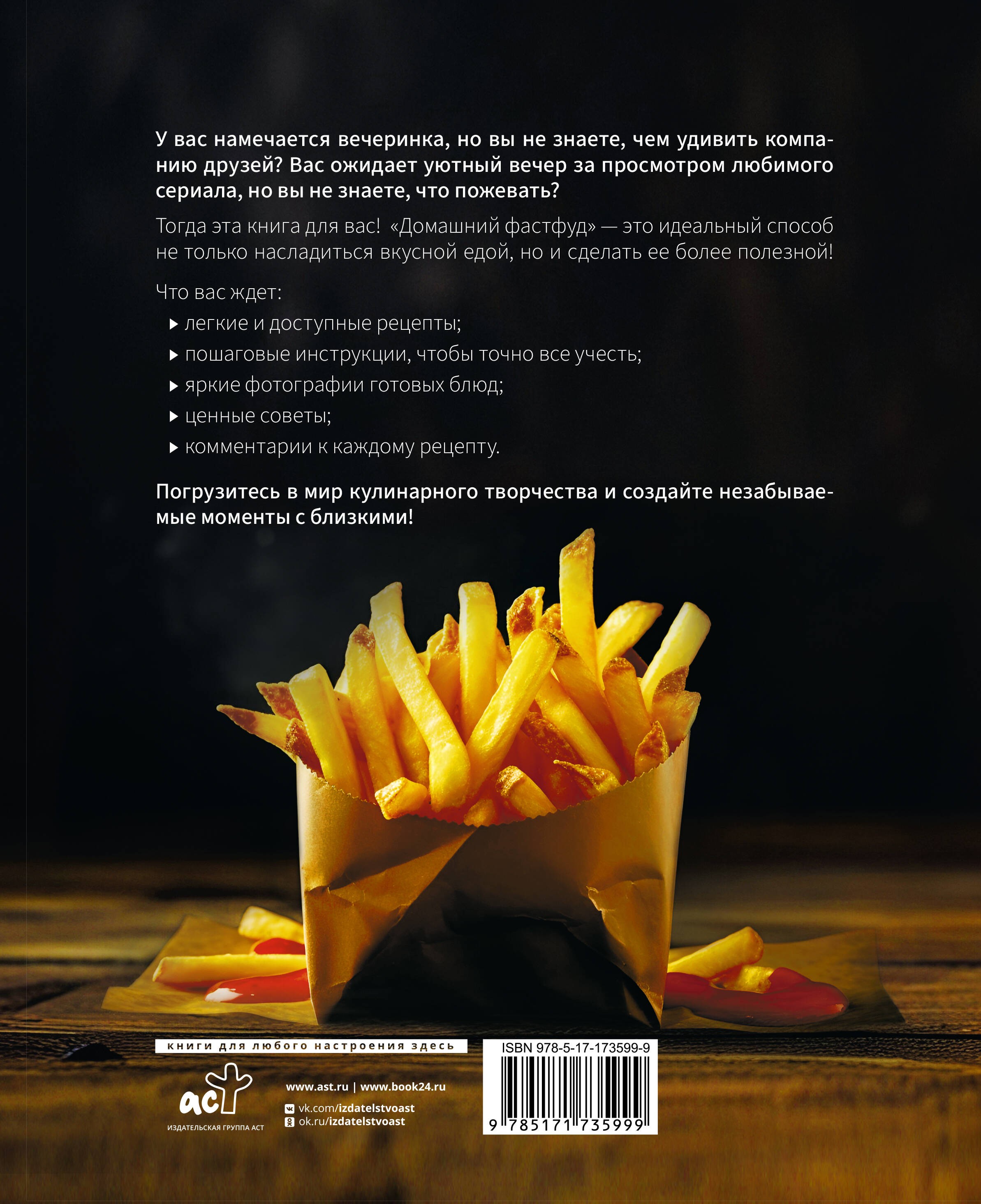 У вас намечается вечеринка, но вы не знаете, чем удивить компанию друзей? Вас ожидает уютный вечер за просмотром любимого сериала, но вы не знаете, что пожевать?Тогда эта книга для вас! «Домашний фастфуд» — это идеальный способ не только насладиться вкусной едой, но и сделать ее более полезной!Что вас ждет: легкие и доступные рецепты; пошаговые инструкции, чтобы точно все учесть;яркие фотографии готовых блюд; ценные советы; комментарии к каждому рецепту. Погрузитесь в мир кулинарного творчества и создайте незабываемые моменты с близкими.