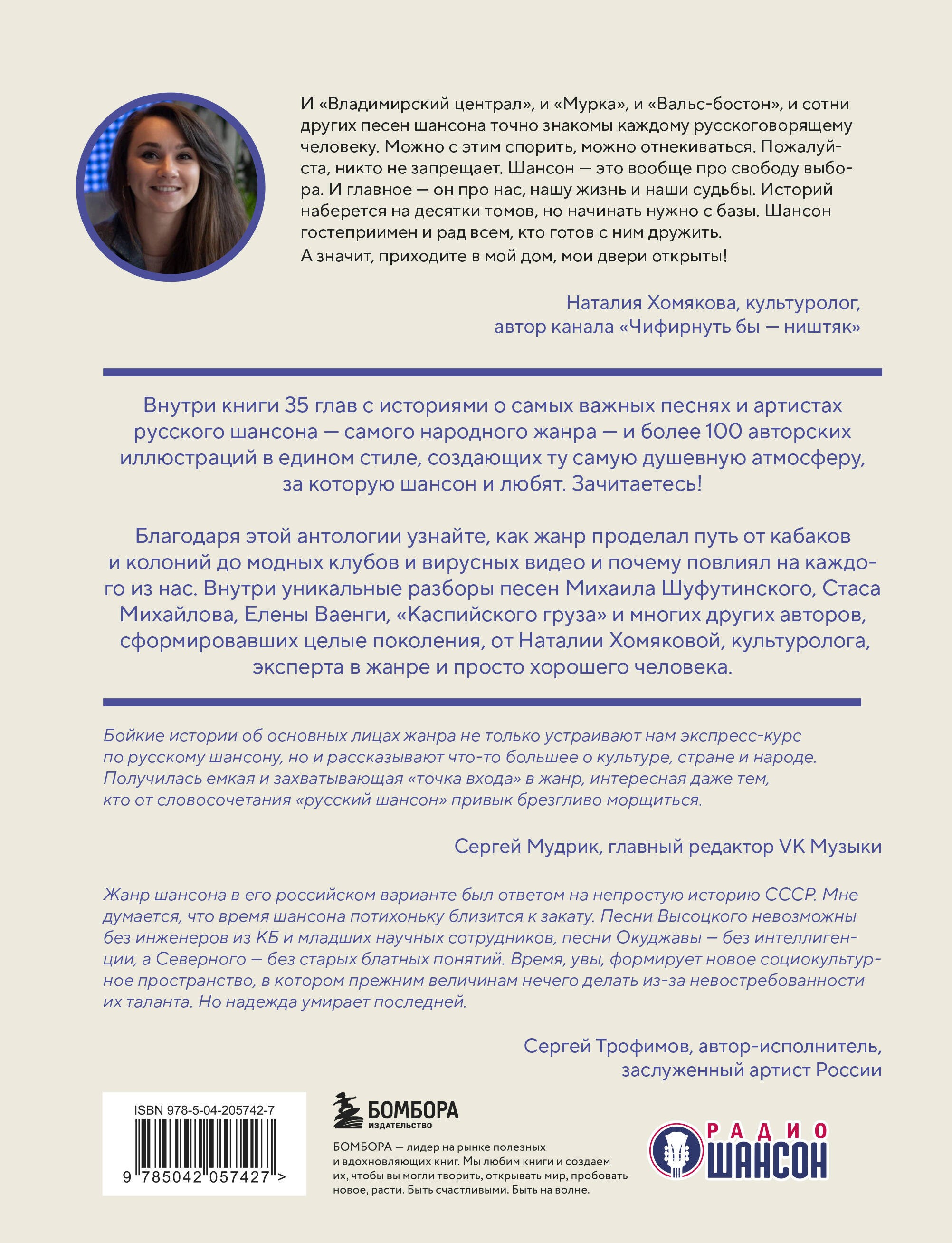 Пожалуй, ни один жанр не внес на нашу музыкальную сцену столько самобытного, сколько шансон. Блатная песня, романтические баллады, «гимны» кавказских застолий, и даже… рэп. Все это окружает нас и формирует культурную среду, в которой уже далеко не первое десятилетие живет и меняется российское общество.Внутри своей книги культуролог, исследователь шансона и автор канала «Чифирнуть бы, ништяк!» Наталия Хомякова разбирает жанр на примере 35 культовых песен: от Михаила Круга и группы «Бутырка» до Стаса Михайлова и «Каспийского Груза». Коллекция нетленных хитов собрана внутри первого большого исследования шансона, написанного в жанре нон-фикшн.Истории песен сопровождаются уникальными иллюстрациями к каждой главе. Также внутри вы найдете QR-коды, которые ведут на собранные автором плейлисты к главам — каждый из них поможет лучше понять этот жанр, или просто взглянуть на него под другим углом.Из книги вы сможете узнать:- Кем была знаменитая Мурка, героиня одноименной песни?- Почему обычно губит «к одиннадцати туз»?- Как Стас Михайлов стал секс-символом поколения?А также многое другое! Зачитаетесь!«Возможно, если ответить на вопрос "Что такое русскии? шансон?", можно понять, кто такие мы с вами». — Олег Кармунин, музыкальный критик«Бойкие истории об основных лицах жанра не только устраивают нам экспресс-курс по русскому шансону, но и рассказывают что-то большее о культуре, стране и народе». — Сергей Мудрик, главный редактор VK-музыки