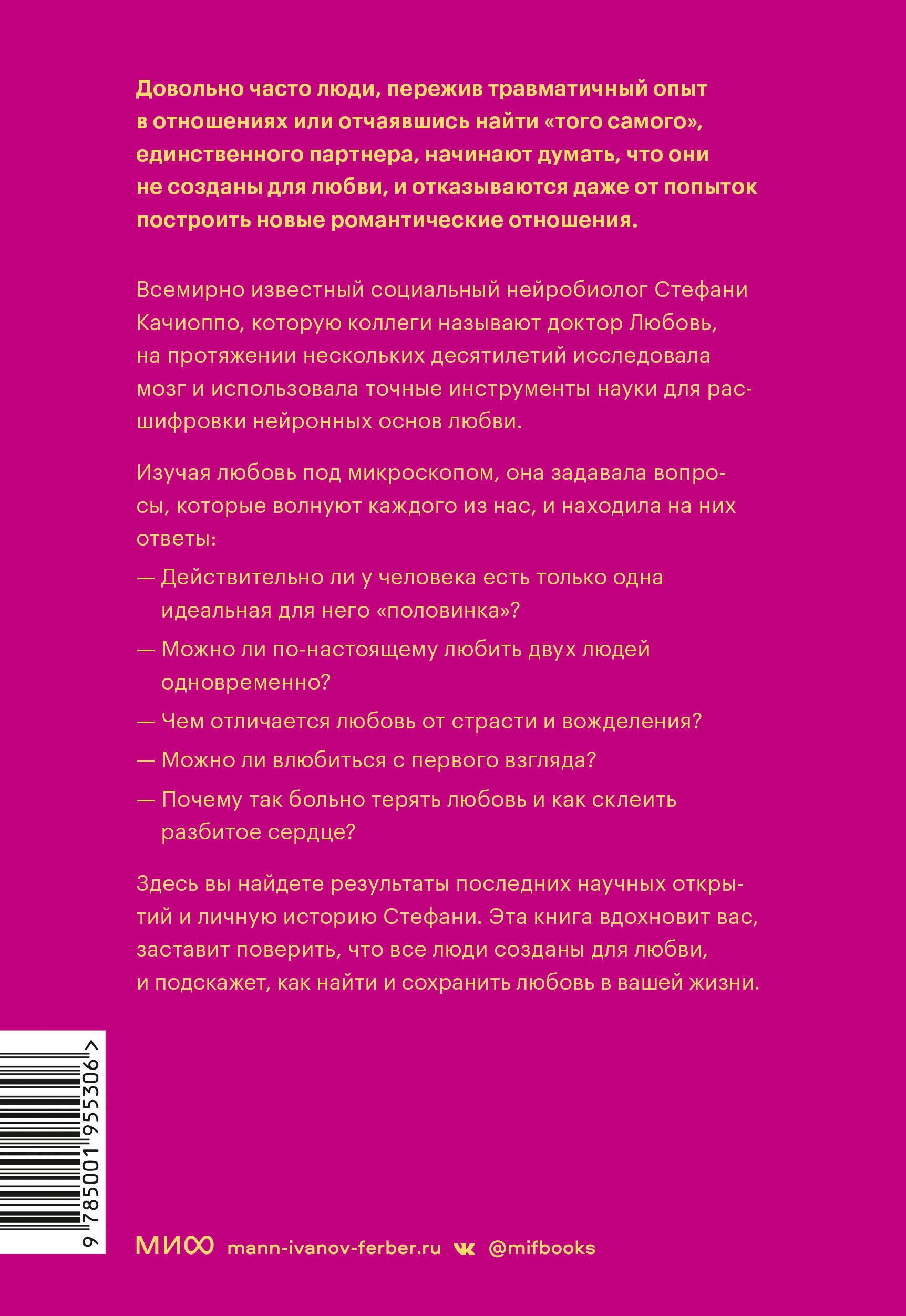 Выдающийся нейробиолог и психиатр Стефани Качиоппо рассказывает о том, как любовь влияет на нас, и доказывает, что именно способность любить делает нас людьми.Любовь обладает великой силой — не просто соединяет нас эмоционально, но и помогает лучше думать, быстрее восстанавливаться после болезни и в конечном счете способствует более продуктивной и долгой жизни.И все это не красивые слова, а доказанные научные факты. Стефани многие годы посвятила исследованиям любви и с помощью современных методов визуализации выясняла, как поиск партнера, романтические отношения и развитие вместе с партнером меняют наш мозг.Изучая любовь под микроскопом, она задавала вопросы, которые волнуют каждого, и находила на них ответы:— Можно ли любить одного партнера вечно?— Является ли моногамия продуктом общества или биологии человека?— Есть ли научное обоснование сказки о долгой и счастливой любви?— Есть ли родственные души и любовь с первого взгляда?— Можем ли мы распутать сложные отношения между любовью и желанием?— Почему найти любовь так трудно?В своей нежной и одновременно научно обоснованной книге Стефани объясняет, как и почему мы влюбляемся, что делает любовь вечной и как пережить утраченную любовь — все это основано на передовых открытиях в области химии мозга и поведенческих наук, а также на ее опыте. Объяснения и советы переплетаются с трогательной личной историей: от знакомства с мужем, известным ученым Джоном Качиоппо, и неразрывной связи с ним до переживания горя в связи с уходом супруга от онкологии и исцеления. Опыт автора и ее работа обогащают друг друга, создавая уникальное сочетание науки и лирики.Для кого эта книга:Для читателей бестселлеров "Любовь на всю жизнь" и "Обними меня крепче".Для всех, кому интересно узнать, что такое любовь.