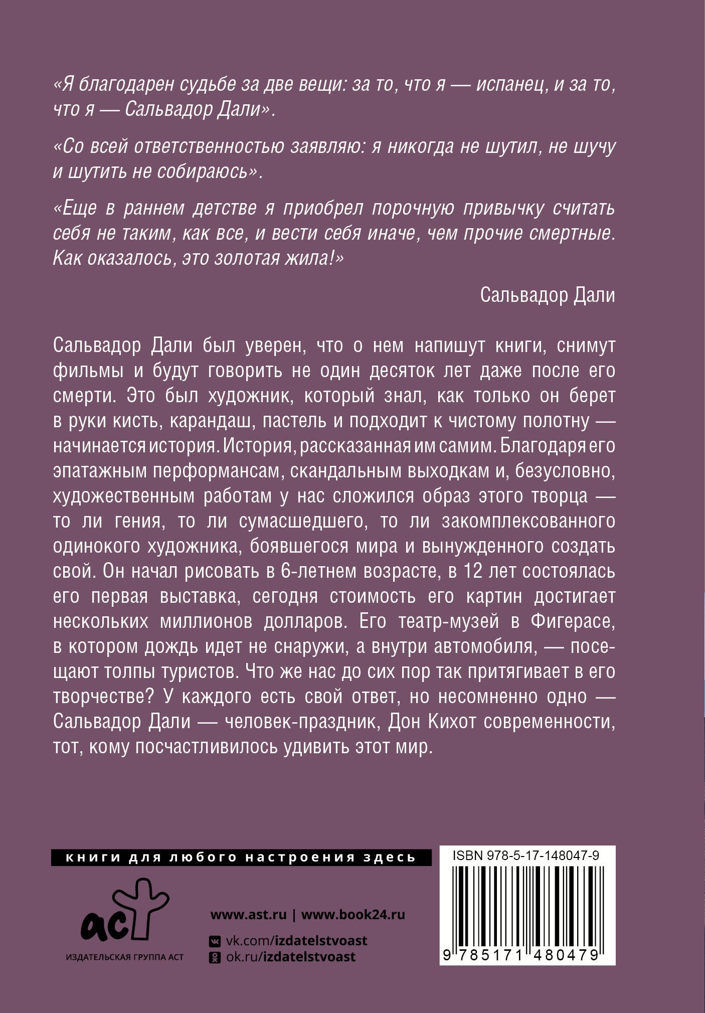 Компактный иллюстрированный гид по творчеству Сальвадора Дали размером с ладонь, напечатанный на матовой мелованной бумаге, с лентой ляссе. "Еще в раннем детстве я приобрел порочную привычку считать себя не таким, как все, и вести себя иначе, чем прочие смертные. Как оказалось, это золотая жила!" – Сальвадор Дали.