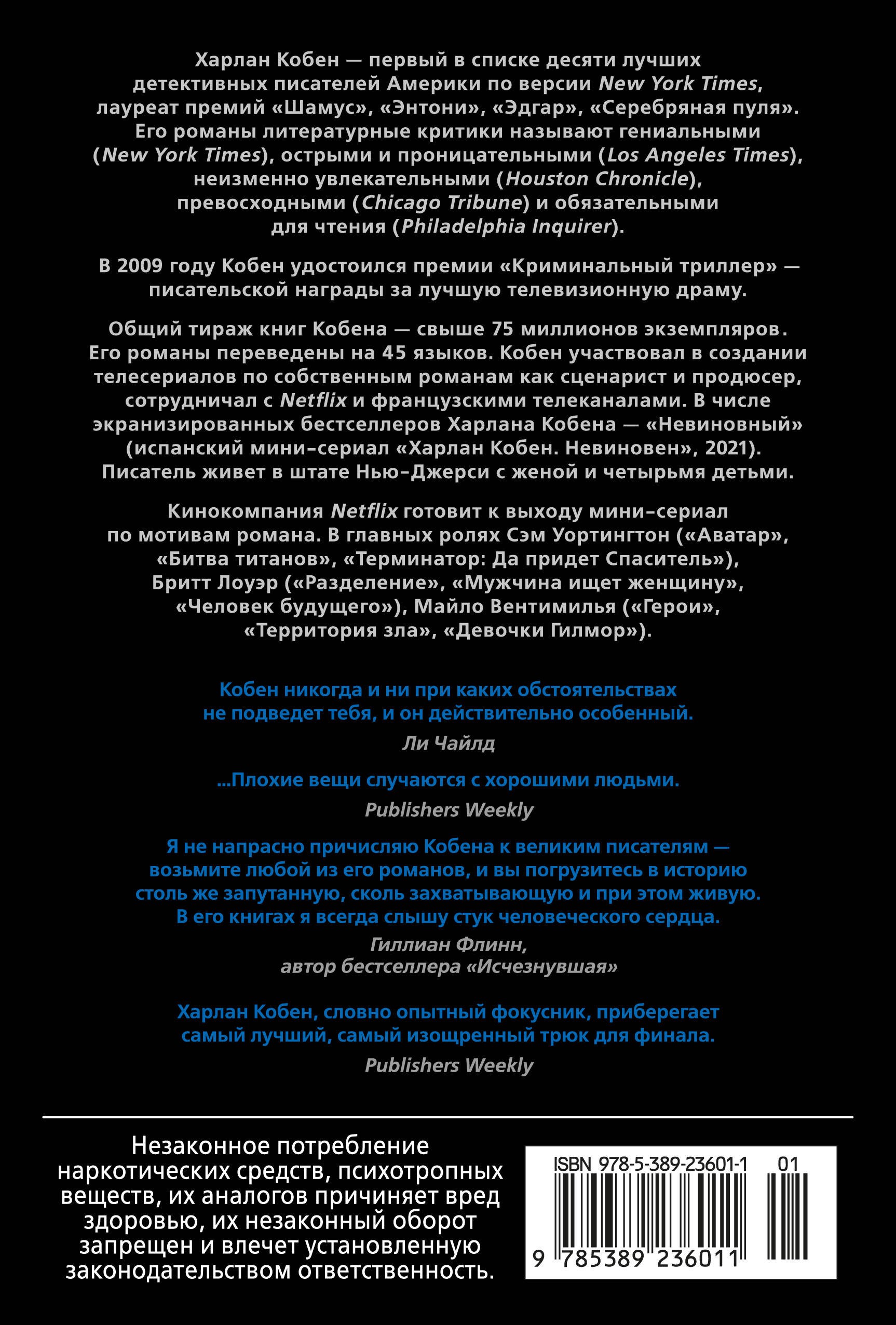 Харлан Кобен пишет книги в жанре детективного и мистического триллера, зачастую его романы раскрывают страшные тайны прошлого, казалось бы, самых обычных семей. Многие книги Кобена превратились в экранизации, недавно на Netflix вышли мини-сериалы по книгам «Незнакомец» и «Невиновный».Однажды ночью Дэвид просыпается и видит на себе кровь — не свою, а трехлетнего Мэттью. И хотя Дэвид твердо знает, что не убивал сына, улики против него неопровержимы.Спустя пять лет Дэвида навещает в тюрьме сестра его жены — с ошеломляющей новостью и с фотографией, сделанной в парке развлечений. Мальчик на снимке — это Мэттью. Он жив!А значит, надо бежать из тюрьмы. Надо спасти сына. Надо очистить свое имя.И узнать правду о случившемся в ту роковую ночь.