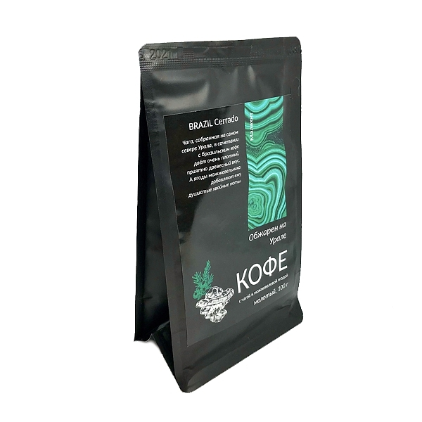 Кофе с чагой и можжевеловой ягодой в стильной чёрной упаковке с принтом малахит. Свежеобжаренный бразильский кофе перемалывается с сушеной чагой и можжевеловой ягодой, собранными на северном Урале. Самый уральский кофе для ценителей напитка и любителей попробовать новое. Масса 100 г.