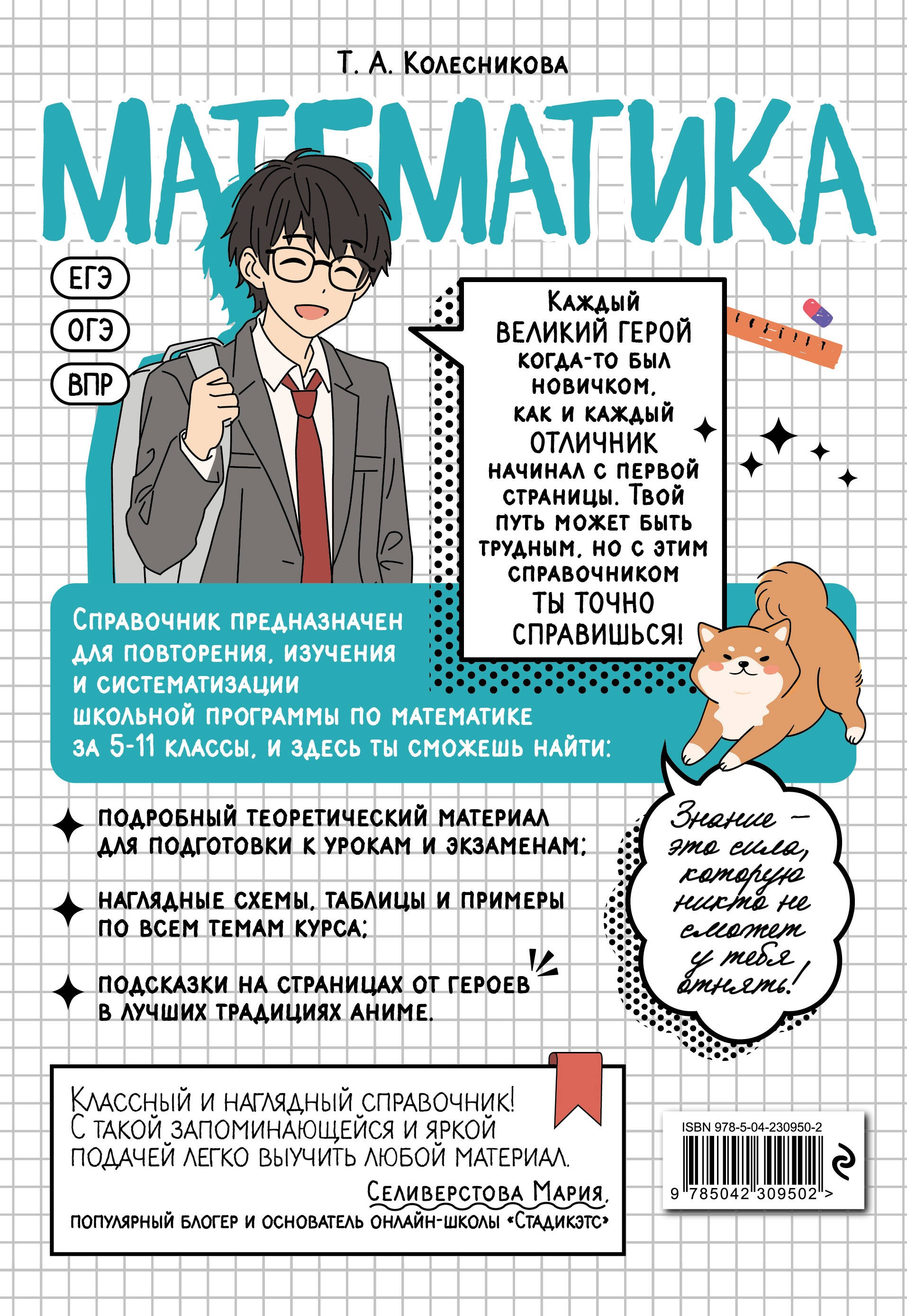 Справочник по математике в аниме-стиле — это современное учебное пособие для учащихся 5—11 классов, которое объединяет школьные знания и визуальную эстетику аниме-культуры. Вместо сухих определений и скучных параграфов на страницах книг вас будут ждать милые и смешные аниме-персонажи, чьи подсказки помогут разобрать материал любой сложности в более живом и увлекательном формате, подготовиться к урокам или предстоящим экзаменам. Более того, вся теория дополнительно сопровождается удобными схемами, забавными рисунками и наглядными примерами. Такой креативный визуальный подход к обучению обеспечивает лёгкость восприятия и эффективность запоминания информации. Прокачай свой уровень на максимум и пройди весь школьный курс вместе с героями в стиле аниме!Пособие предназначено для школьников и учителей, для любителей аниме и манги, а также для всех, кто интересуется вопросами математики.