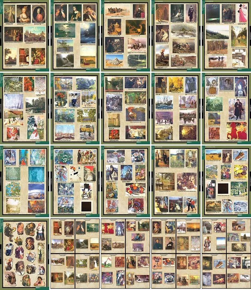 В комплекте плакатов представлено 8 стилей русской живописи XVIII-XX веков: классицизм, романтизм, реализм, импрессионизм, символизм, модерн, авангард и соцреализм. На каждом плакате - репродукции картин художников, которые наиболее ярко проявили себя в данном стиле и картины которых могут служить "картинами-эталонами" этого стиля.