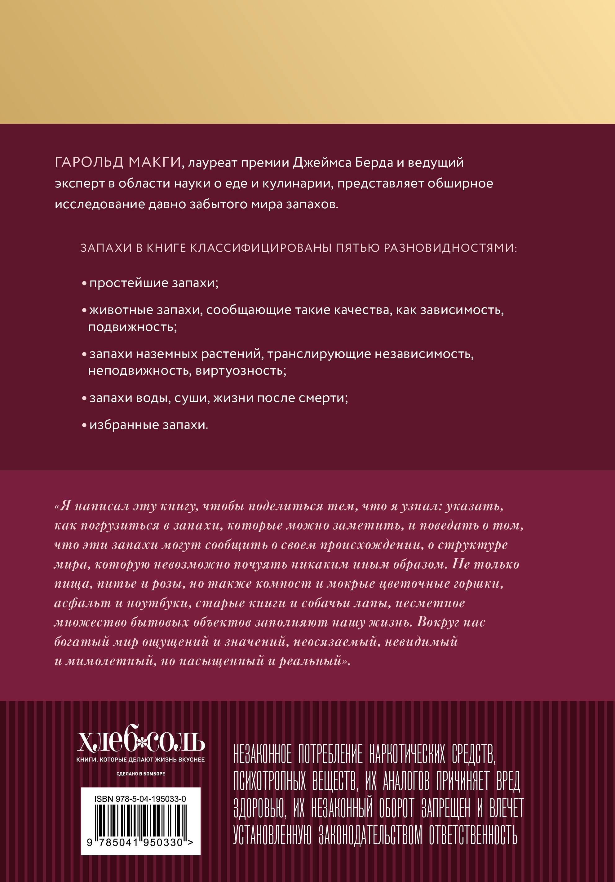 НЕЗАКОННОЕ ПОТРЕБЛЕНИЕ НАРКОТИЧЕСКИХ СРЕДСТВ, ПСИХОТРОПНЫХ ВЕЩЕСТВ, ИХ АНАЛОГОВ ПРИЧИНЯЕТ ВРЕД ЗДОРОВЬЮ, ИХ НЕЗАКОННЫЙ ОБОРОТ ЗАПРЕЩЕН И ВЛЕЧЕТ УСТАНОВЛЕННУЮ ЗАКОНОДАТЕЛЬСТВОМ ОТВЕТСТВЕННОСТЬ.Гарольд Макги, автор, лауреат премии Джеймса Берда и ведущий эксперт в области науки о еде и кулинарии, представляет обширное исследование давно забытого мира запахов. В «О запахах и ароматах в кулинарии и не только» Макги отправляет нас в чувственное приключение: от сернистой земли, зарождающейся более четырех миллиардов лет назад, к заполненному фруктами горному хребту Тянь-Шаня к северу от Гималаев, к клавиатуре вашего ноутбука, где прослеживаются особые ноты между клавишами. Мы понюхаем обычное (мокрый тротуар и скошенная трава) и необыкновенное (амбра и трюфели), восхитительное (розы и ваниль) и вызывающее (болота и дурианы). Макги знакомит нас с реальными частицами материи, которые мы вдыхаем, — с молекулами, которые запускают наше восприятие, вызывают цитрусовые запахи кориандра и пива, а также лечебные запахи нарциссов и морских ежей. Начиная с происхождения этих молекул в межзвездном пространстве, Макги продвигается вперед через запахи нашей планеты, воздуха и океанов, леса, лугов и города, вплоть до запахов благовоний, духов, вина и еды.