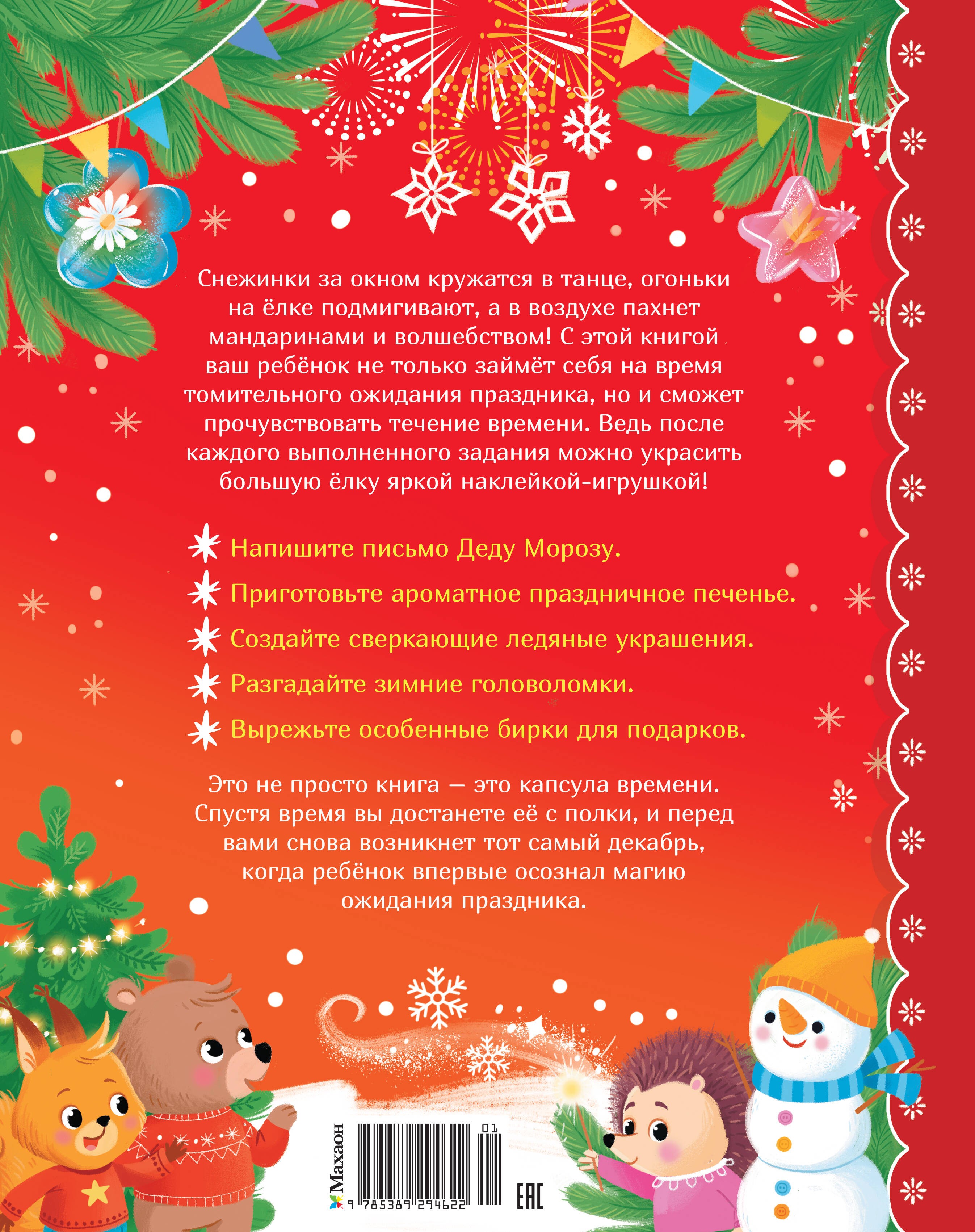 Волшебный адвент-календарь – лучший подарок для мальчиков и девочек на Новый год и Рождество!Каждый день декабря – маленькое чудо!С этой книгой ваш ребёнок не только займёт себя на время томительного ожидания праздника, но и сможет прочувствовать течение времени.•Напишите письмо Деду Морозу с готовым вырезным шаблоном.•Вырежьте именные бирки для подарков.•Украшайте книжную ёлку наклейками после каждого задания.Роскошное подарочное издание премиум-класса:•Обложка с золотой фольгой и искрящейся плёнкой – идеальный рождественский подарок.•Большой формат 22?28 см – удобно для детских ручек.•Плотная офсетная бумага, 80 страниц и праздничные иллюстрации.•50 ярких новогодних наклеек в комплекте.Твёрдый переплёт и качественные материалы сохранят это издание на долгие годы, чтобы через время вы вместе с ребёнком могли с теплотой вспоминать эти волшебные моменты.Идеальный подарок для мальчиков и девочек от 5 до 10 лет на Новый год и Рождество.