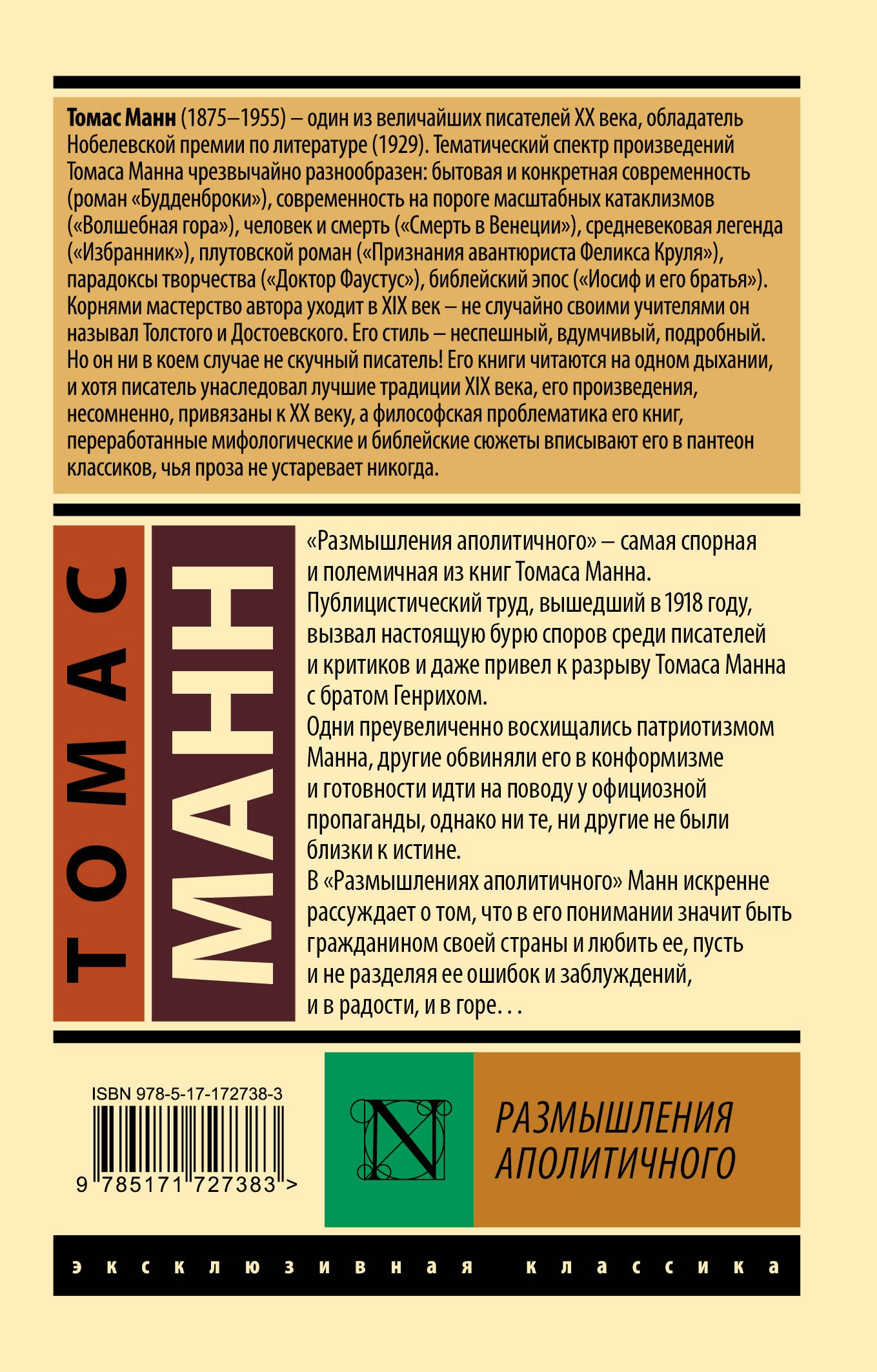 — Лауреат Нобелевской премии по литературе Томас Манн — выдающийся немецкий писатель первой половины XX века, автор романов «Иосиф и его братья», «Волшебная гора» и «Будденброки».— «Размышления аполитичного» — самая спорная и полемичная книга Манна. Вышедшая незадолго до поражения Германии в Первой мировой войны, книга поддерживала немецкие имперские амбиции и критиковала всех немцев, кто протестовал против войны.— Издание в серии «Эксклюзивная классика» — в удобном карманном формате и узнаваемом оформлении.