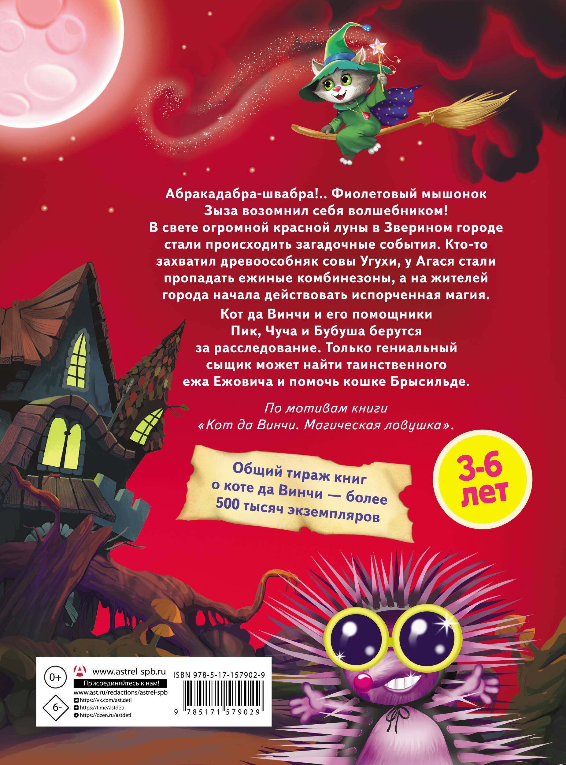 Абракадабра-швабра!.. Фиолетовый мышонок Зыза возомнил себя волшебником!В свете огромной красной луны в Зверином городе стали происходить загадочные события. Кто-то захватил древоособняк совы Угухи, у Агася стали пропадать ежиные комбинезоны, а на жителей города начала действовать испорченная магия. Кот да Винчи и его помощники Пик, Чуча и Бубуша берутся за расследование. Только гениальный сыщик может найти таинственного ежа Ежовича и помочь кошке Брысильде.