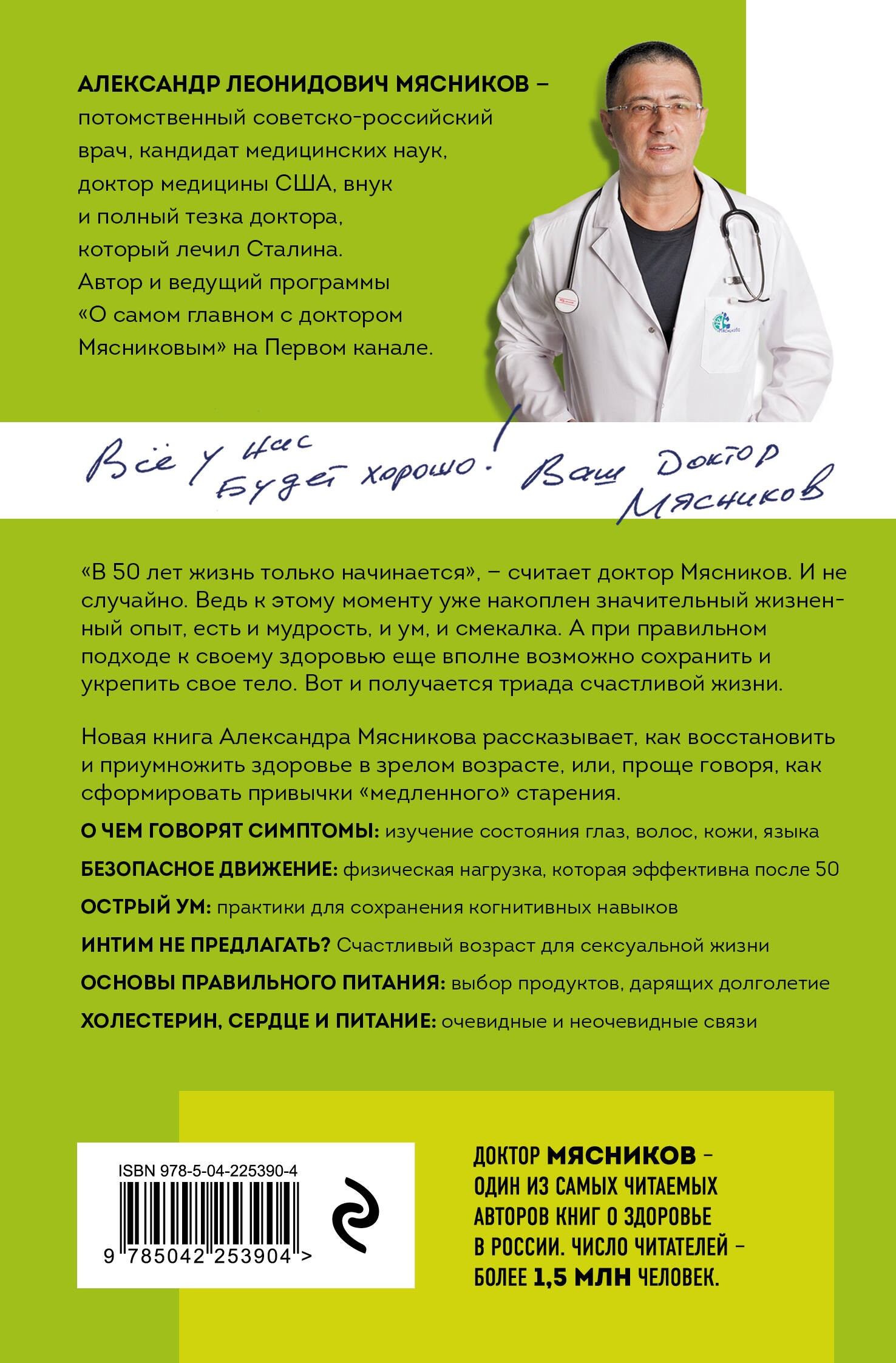Новая книга Александра Мясникова рассказывает, как восстановить и преумножить здоровье в зрелом возрасте, или, проще говоря, как сформировать привычки «медленного» старения.- О чем говорят симптомы: изучение состояния глаз, волос, кожи, языка- Безопасное движение: физическая нагрузка, которая эффективна после 50-ти- Острый ум: практики для сохранения когнитивных навыков- Интим не предлагать? Счастливый возраст для сексуальной жизни- Основы правильного питания: выбор продуктов, дарящих долголетие- Холестерин, сердце и питание: очевидные и неочевидные связи