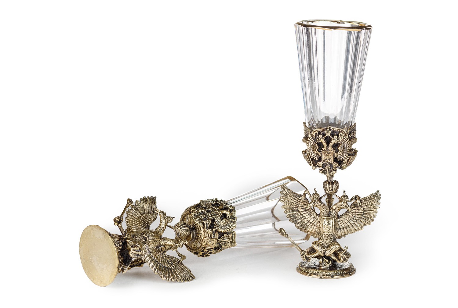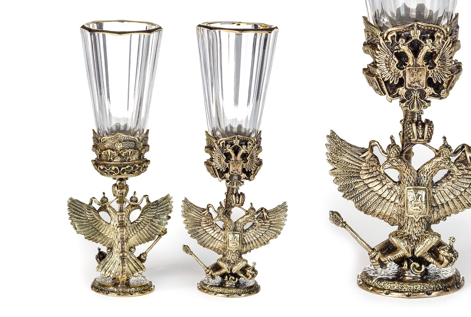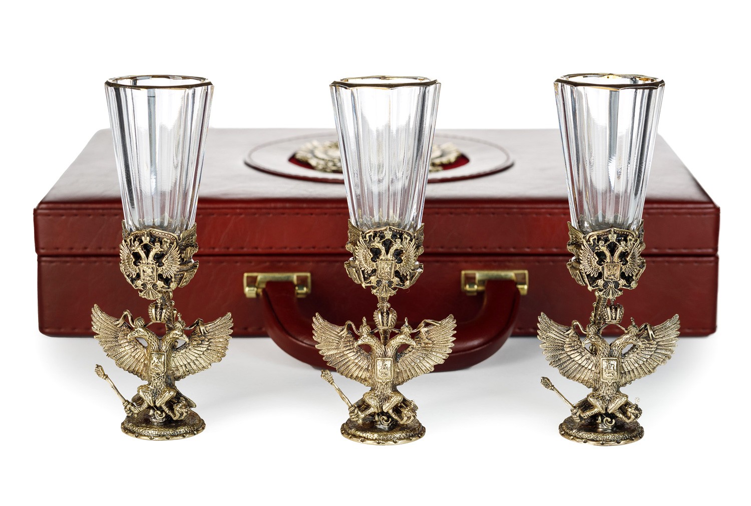 Распростертые крылья, зоркий взгляд, одна корона над двумя головами, а в лапах скипетр и держава. Герб России дизайнеры изобразили на лафитниках для водки вместо ножки. Дополняет набор лафитников изысканная упаковка из искусственной кожи