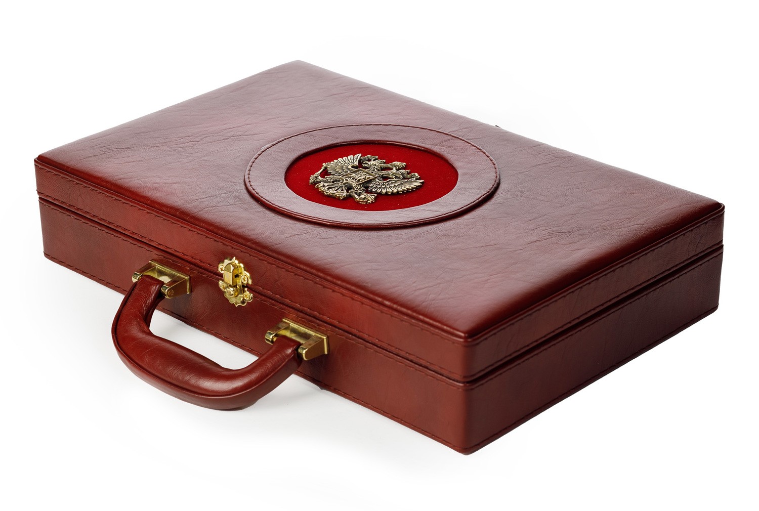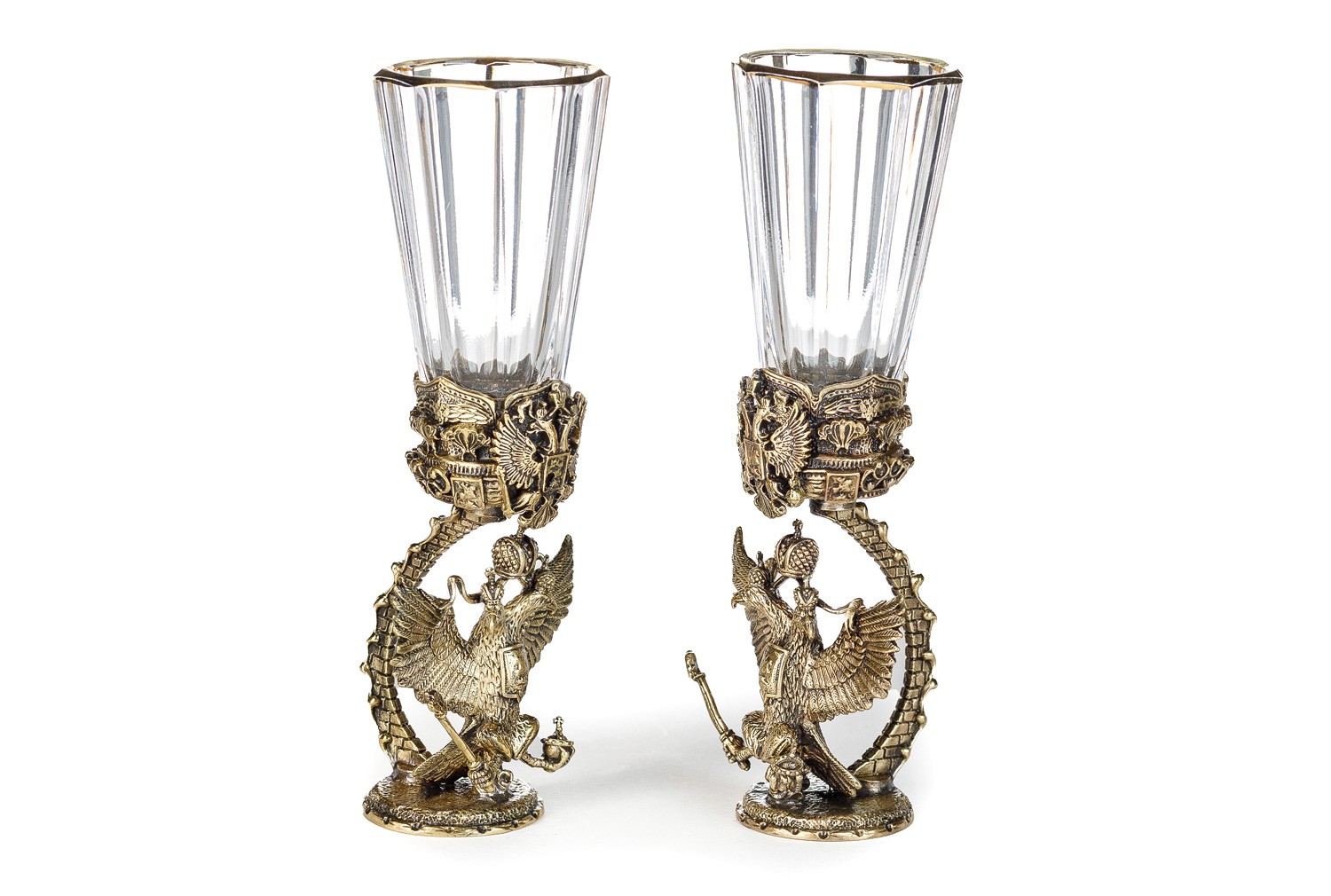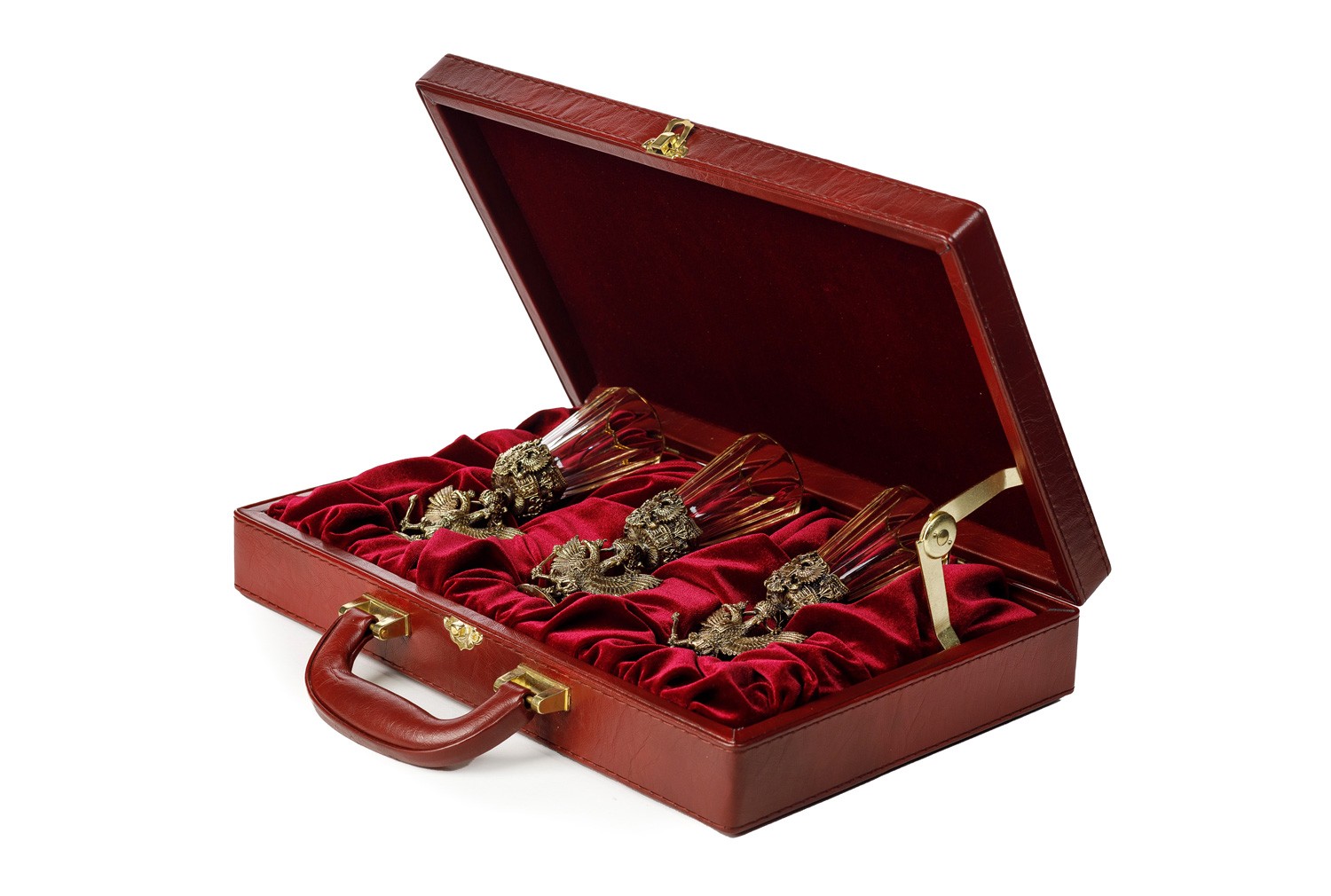 Распростертые крылья, зоркий взгляд, одна корона над двумя головами, а в лапах скипетр и держава. Герб России дизайнеры изобразили на лафитниках для водки вместо ножки. Дополняет набор лафитников изысканная упаковка из искусственной кожи