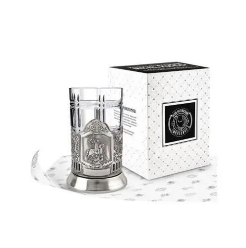 Подстаканник изготовлен из латуни, имеет декоративно-защитное гальваническое покрытие никелем. В набор с подстаканником входит хрустальный стакан, который предназначен для горячих напитков и выдерживает высокие температуры.