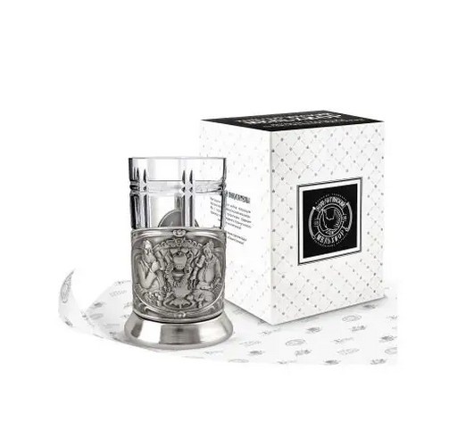 Подстаканник изготовлен из латуни, имеет декоративно-защитное гальваническое покрытие никелем. В набор с подстаканником входит хрустальный стакан, который предназначен для горячих напитков и выдерживает высокие температуры.