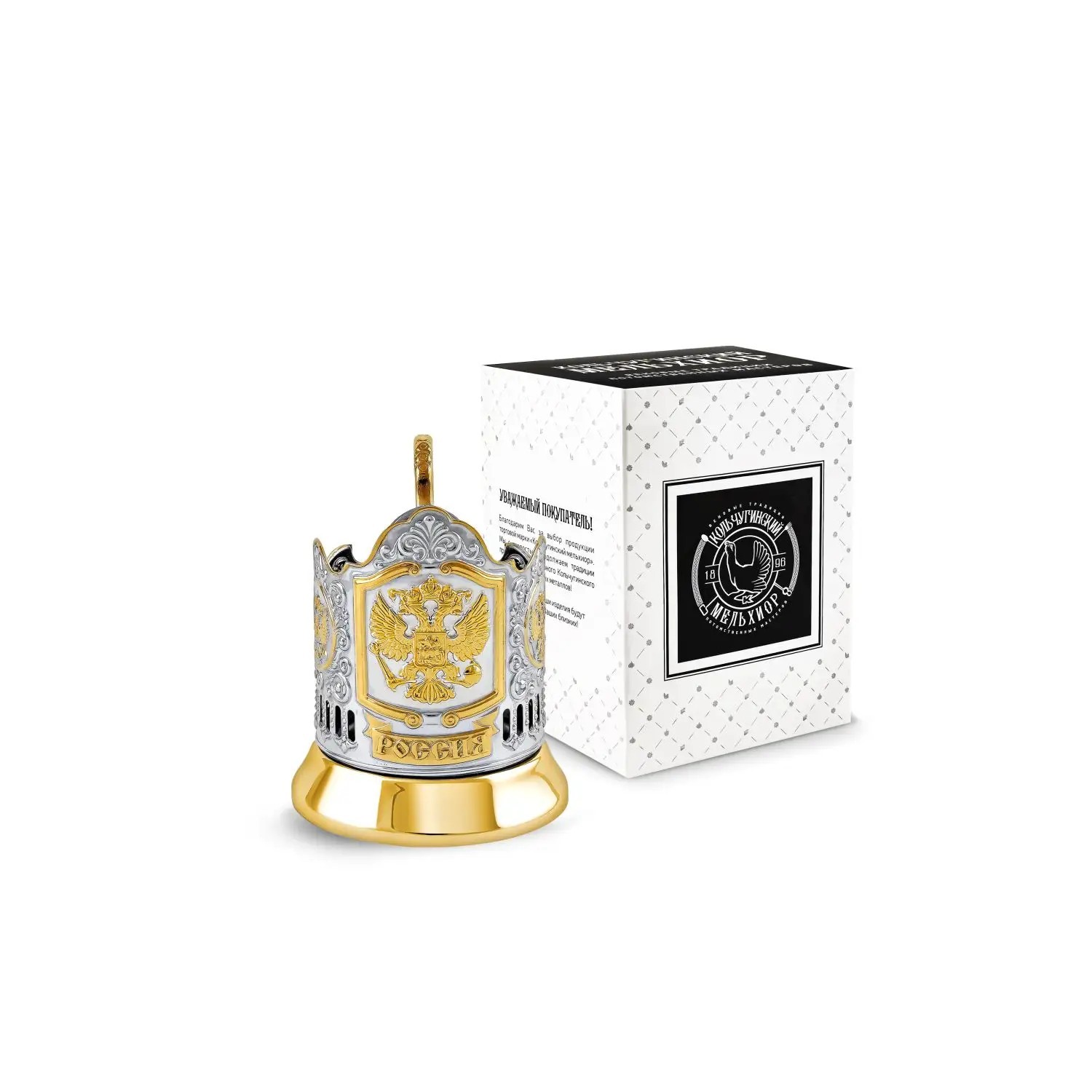 Подстаканник изготовлен из латуни, имеет декоративно-защитное гальваническое покрытие никелем и позолочен. Подстаканник в фирменной упаковке – готовый подарок мужчине и женщине, коллеге, другу, руководителю, папе, дедушке, брату. «Кольчугинский мельхиор» - известный завод-изготовитель России - в настоящее время производит огромное количество моделей подстаканников. На странице бренда «Кольчугинский мельхиор». У нас вы можете приобрести подстаканники к любому поводу: День рождения, 23 февраля, Юбилей, Новый год.