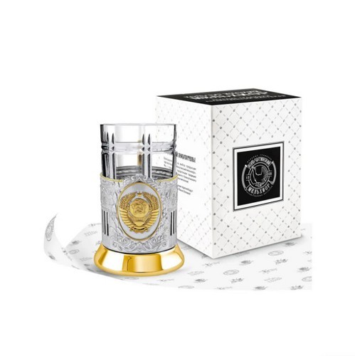 Подстаканник изготовлен из латуни, имеет декоративно-защитное гальваническое покрытие никелем и позолочен. В набор с подстаканником входит хрустальный стакан, который предназначен для горячих напитков и выдерживает высокие температуры. Объем стакана 250 мл.
