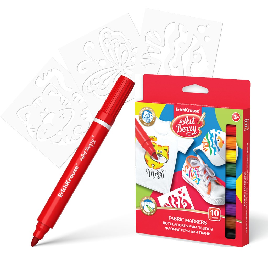 Фломастеры для ткани с 3-мя трафаретами. Яркие чернила, рекомендуемые для хлопковых тканей, равномерно ложатся на поверхность и не расплываются. Рисунок выдерживает многократную стирку. Подробная инструкция по нанесению рисунка и уходу внутри коробки. Герметичный корпус из полипропилена не образует острых сколов при поломке и предотвращает высыхание чернил, обеспечивая увеличенный срок хранения - 5 лет. Пишущий узел конической формы позволяет рисовать разными по ширине линиями 1-7мм, выдерживает сильное нажатие и сохраняет форму в течение длительного срока. Фломастеры снабжены вентилируемыми колпачками. В комплект набора входят 3 трафарета для многократного использования. Европейский