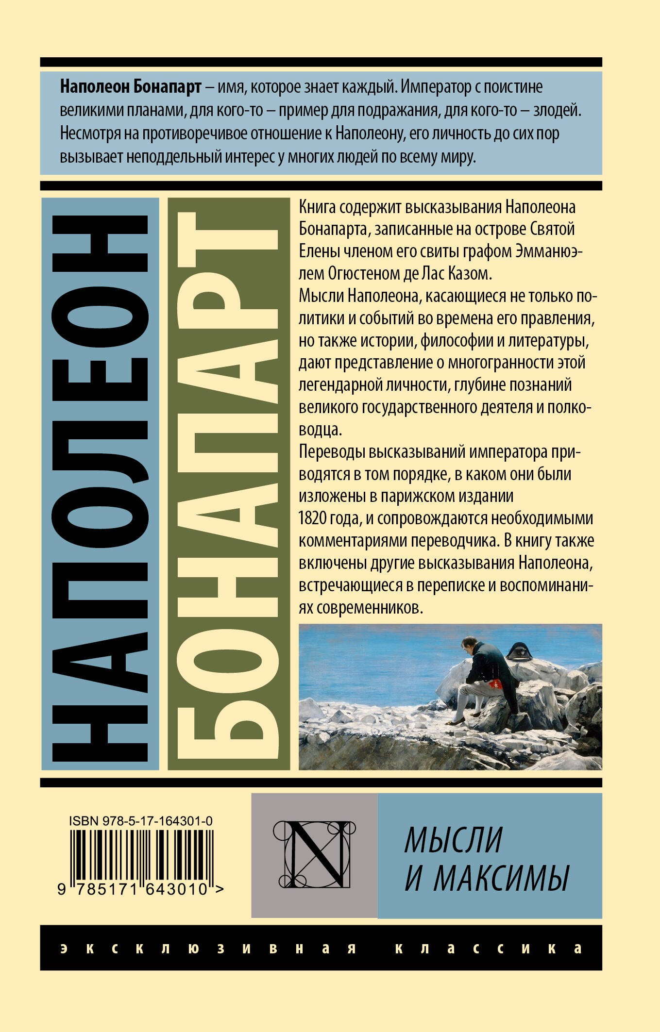 Прежде чем стать выдающимся полководцем и императором, Наполеон Бонапарт увлекался литературой и даже написал художественный роман «Клиссон и Евгения». После того, как его Империя рухнула, а сам он оказался в изгнании на острове Святой Елены, опальный правитель вновь взялся за перо и написал сразу две книги — «Воспоминание об истории с Наполеоном» и «Мысли и максимы».В книгу «Мысли и максимы» вошли афористические зарисовки бывшего императора — остроумные и язвительные заметки об истории, политике, литературе и философии, демонстрирующие всю многогранность познаний и талантов Наполеона.