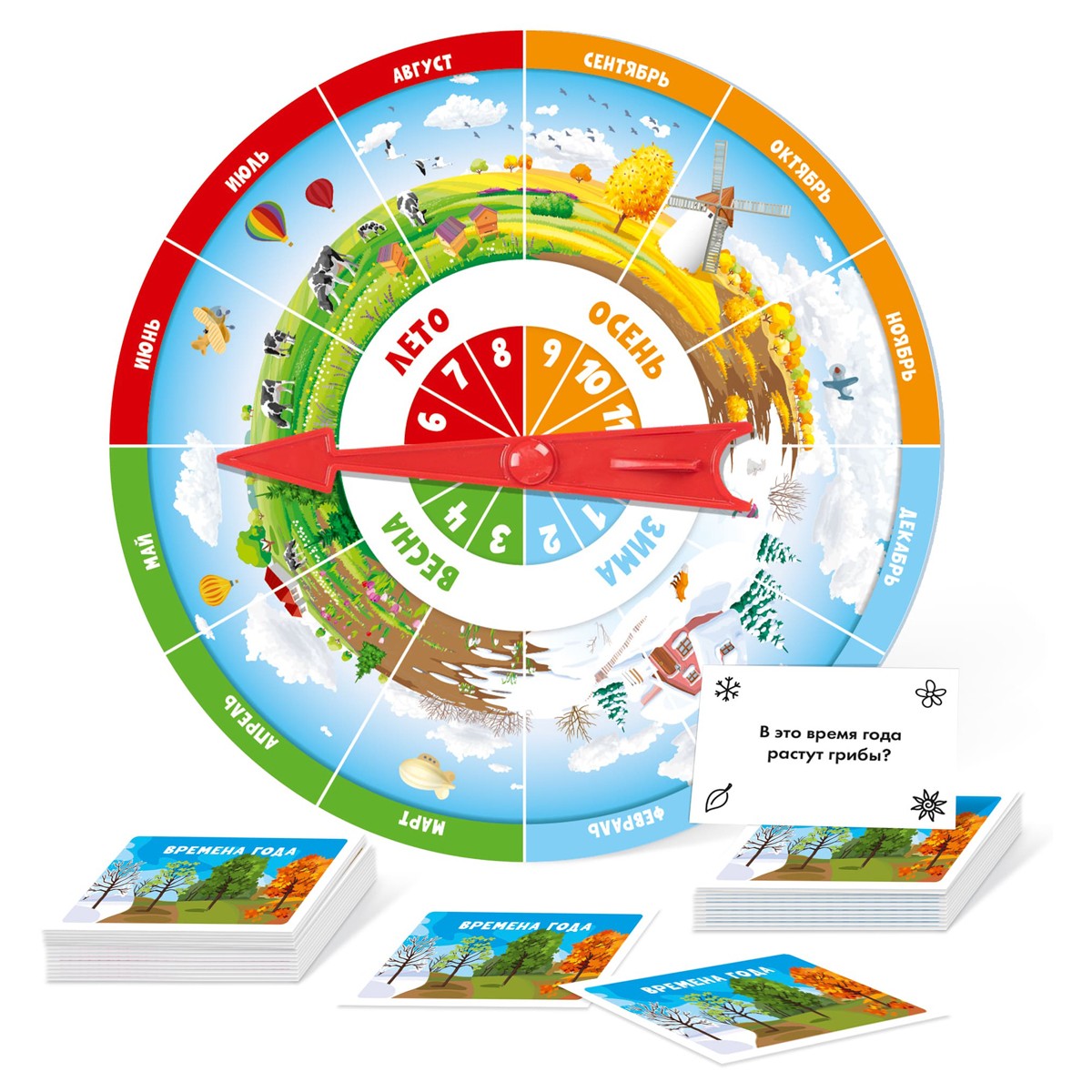 Настольная игра викторина «Времена года». Состав: игровое поле со стрелкой – 1 шт., карточки – 75 шт., брошюра с ответами. Для 2–4 игроков. Материалы: картон, полимерный материал. Для детей от 6 лет.