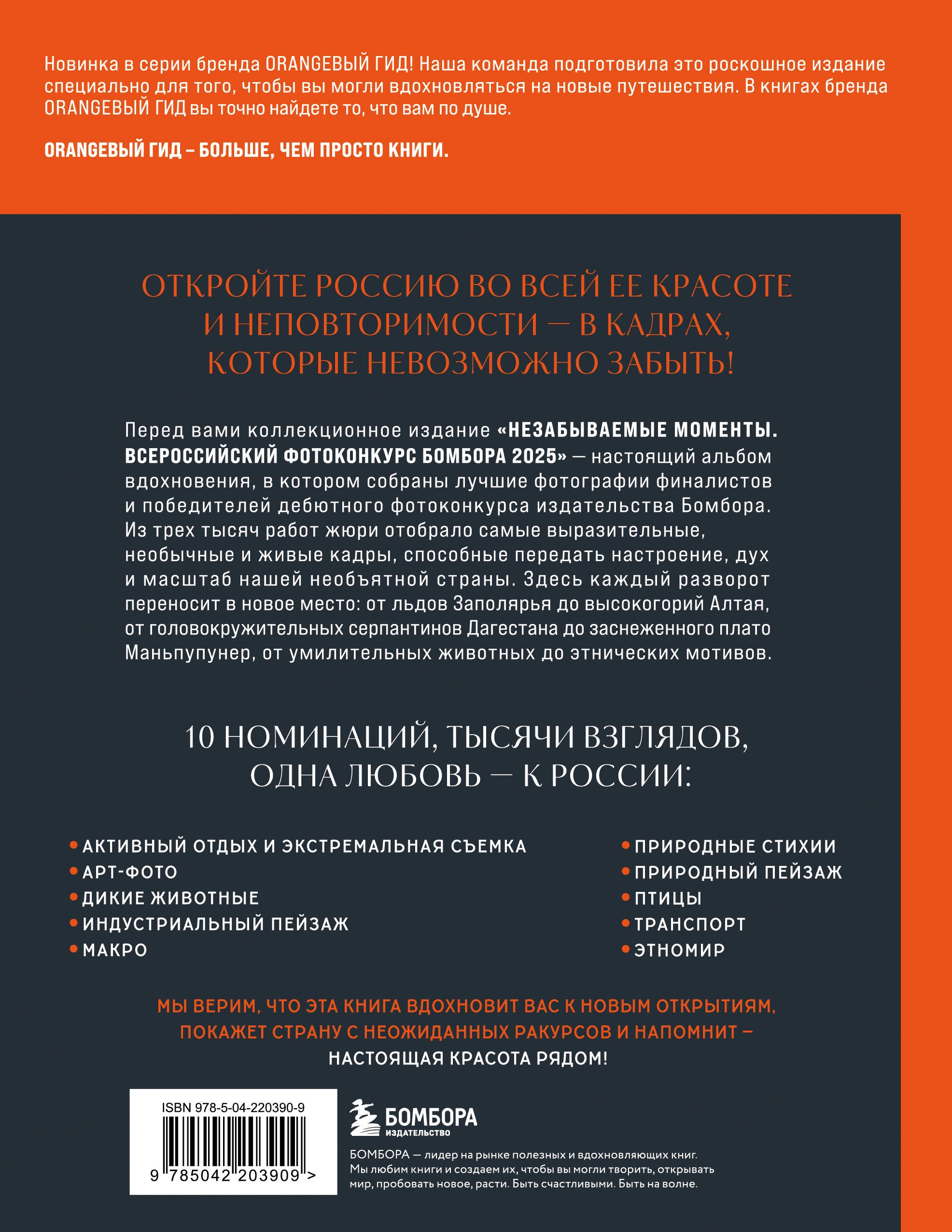 Откройте Россию — многогранную и бескрайнюю — в кадрах, которые невозможно забыть!Перед вами — коллекционное подарочное издание «Незабываемые моменты. Всероссийский фотоконкурс Бомбора 2025» — настоящий альбом вдохновения и признания в любви к стране, где каждый снимок становится откровением.Из более чем трех тысяч заявок жюри выбрало лучшие из лучших — самые выразительные, эмоциональные и неожиданные фотографии, в которых оживает настроение, дух и масштаб России.Каждый разворот — это путешествие:- от ледяных просторов Заполярья до залитых солнцем долин Алтая;- от серпантинов Дагестана до загадочного плато Маньпупунёр;- от умилительных животных и живых портретов до этнических мотивов и пейзажей, наполненных светом и смыслом.10 номинаций. Тысячи взглядов. Одна любовь — к России.Эта книга — визуальная симфония и напоминание о том, как прекрасен мир вокруг.Пусть она вдохновит вас на новые путешествия и поможет вновь увидеть главное — настоящая красота ближе, чем кажется!
