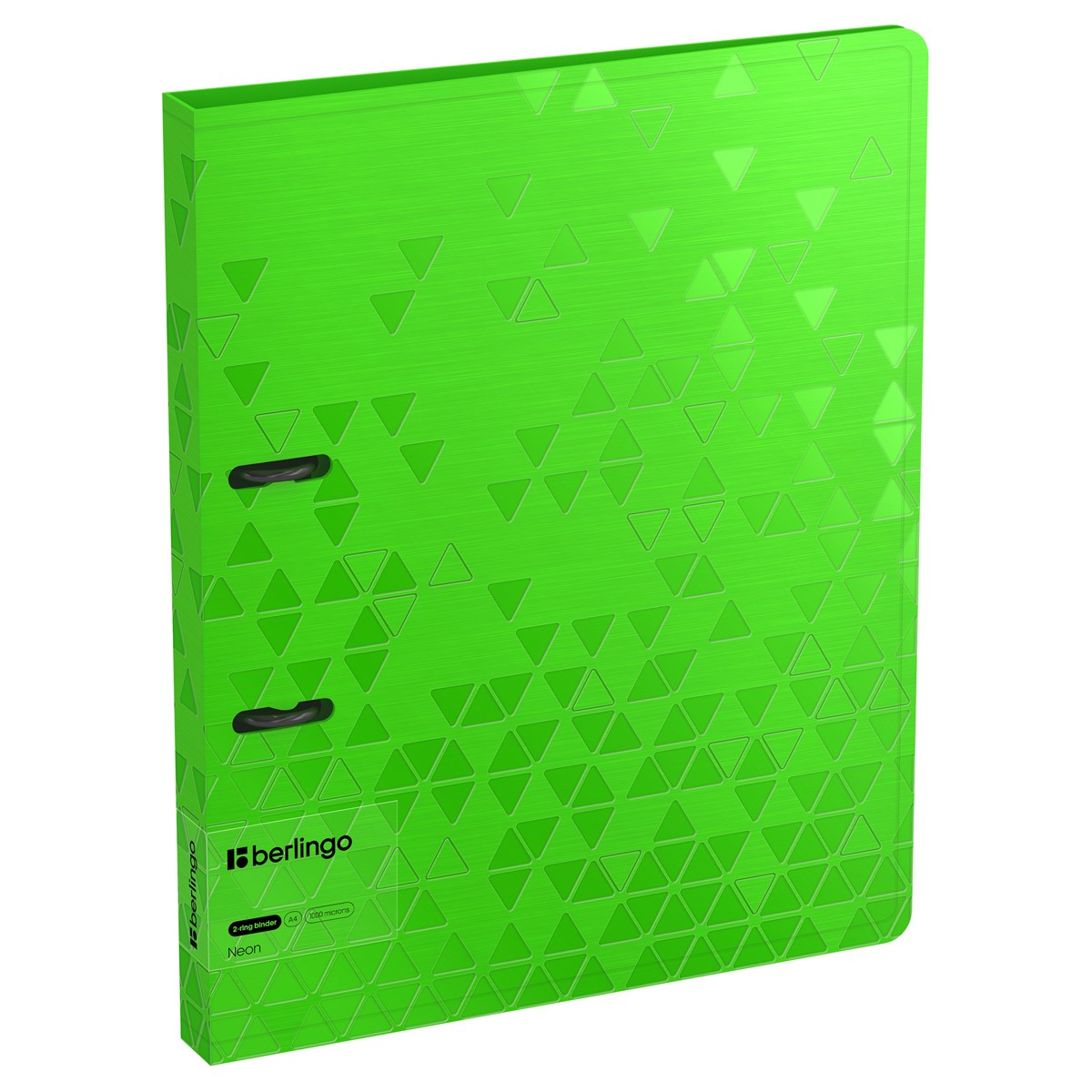 Папка на 2 кольцах Berlingo серии Neon формата А4 (310*250*24 мм) изготовлена из плотного пластика толщиной 1 мм. Вместимость папки – 150 листов, ширина корешка – 24 мм. Кольцевой механизм с 2 кольцами диаметром 20 мм надежно держит перфорированные документы и документы, помещенные в файлы-вкладыши. Специальная D форма колец помогает удобно и ровно хранить документы, которые могут быть выровнены по левому краю, благодаря боковой вертикальной стенке кольца. Диаметр колец – 20 мм. Специальные формовые отверстия в обложке служат для надёжного защелкивания папки в сложенном виде, предотвращают случайное открытие обложки и замятие документов внутри при хранении и транспортировке. Изготовлена из высококачественного полипропилена с матовой текстурой поверхности «рельефные треугольники», на которой не видно отпечатков пальцев и мелких царапин. Предназначена для хранения документов. На внутренней стороне обложки оснащена плотным прозрачным карманом для удобного хранения мелочей: ручки, заметок, визиток, дисков, флешек и др. Упакована в индивидуальный прозрачный пакет по форме.