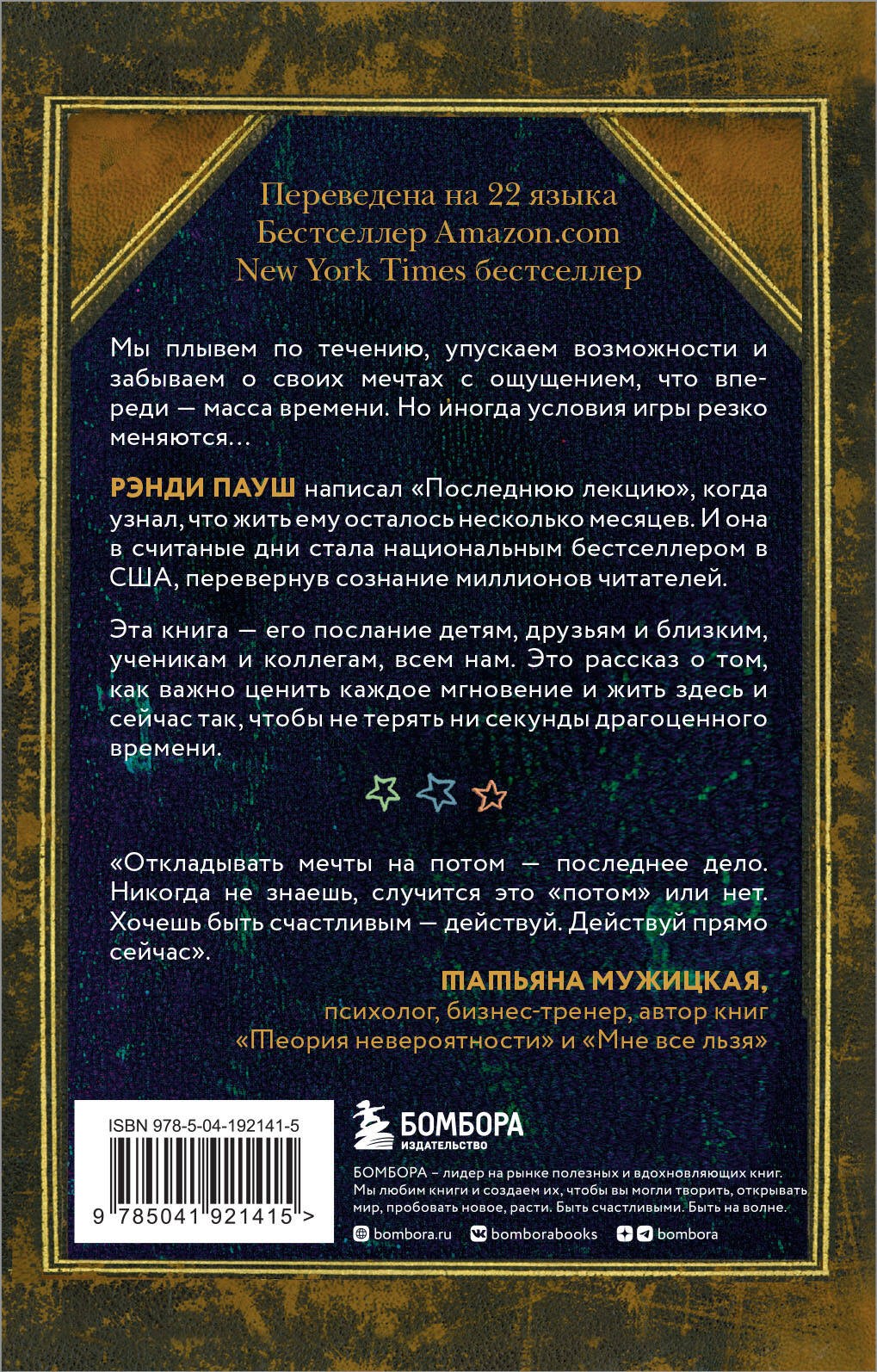 «Сданные нам карты сменить нельзя, но разыграть их можно по своему усмотрению». — Рэнди ПаушМЕЖДУНАРОДНЫЙ БЕСТСЕЛЛЕР.БОЛЕЕ 15 МИЛЛИОНОВ ПРОДАННЫХ ЭКЗЕМПЛЯРОВ ПО ВСЕМУ МИРУ.Что в нашей жизни действительно важно, а что — лишь бестолковая суета? Как надо жить, что делать, чтобы потом не жалеть о напрасно потерянном времени, несбывшихся мечтах, нереализованных возможностях?Очень часто мы не задумываемся об этом, плывем по течению, барахтаемся в рутине с ощущением, что впереди — масса времени. Но иногда условия игры резко меняются...Рэнди Пауш написал «Последнюю лекцию», когда узнал, что жить ему осталось несколько месяцев. И она в считанные дни стала национальным бестселлером в США, перевернув сознание миллионов читателей.Эта книга — его послание детям, друзьям и близким, ученикам и коллегам, всем нам. Это рассказ о том, как надо жить. Как ценить каждое мгновение. Как трепетно относиться к детским мечтам. Как жить так, чтобы не терять ни секунды драгоценного времени.Отзывы:«Откладывать мечты на потом — последнее дело. Никогда не знаешь, случится это потом или нет. Хочешь быть счастливым — действуй. Действуй прямо сейчас». — Татьяна Мужицкая«Рэнди Пауш писал книгу для жены и детей. И вряд ли предполагал, что она будет переведена на десятки языков, ее прочитают миллионы человек и она станет мировым бестселлером». — The Washington Post«Я лично была знакома с Рэнди Паушем, он был гостем в моем шоу. Удивительный человек, написавший книгу, которая потрясла миллионы людей». — Опра Уинфри