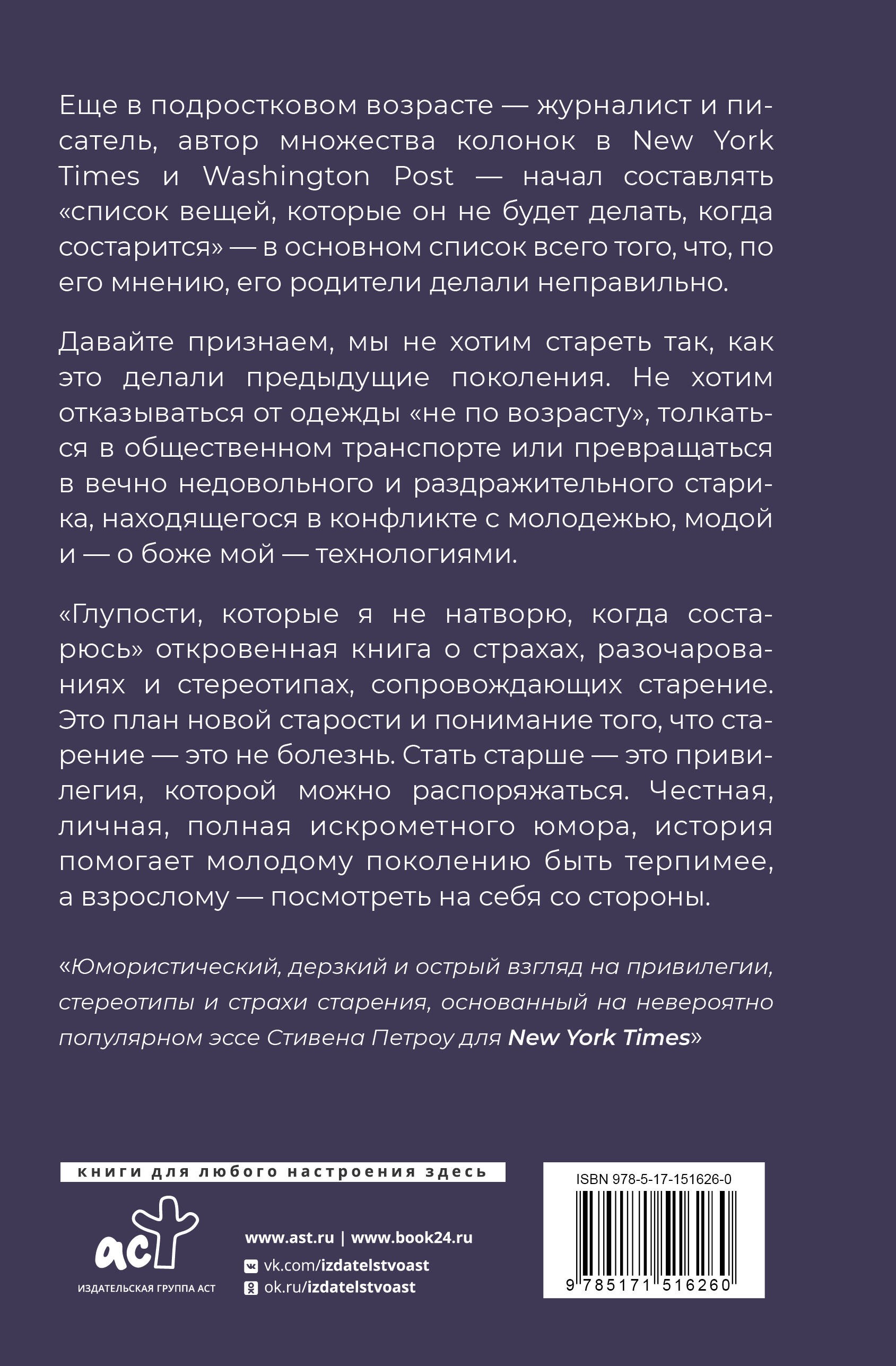 Еще в подростковом возрасте — журналист и писатель, автор множества колонок в New York Times и Washington Post — начал составлять список "вещей, которые он не будет делать, когда состарится" — в основном список всего того, что, по его мнению, его родители делали неправильно.Давайте признаем, мы не хотим стареть так, как это делали предыдущие поколения. Не хотим отказываться от одежды "не по возрасту", толкаться в общественном транспорте или превращаться в вечно недовольного и раздражительного старика, находящегося в конфликтес молодежью, модой и — о боже мой — технологиями."Глупости, которые я не натворю, когда состарюсь" откровенная книга о страхах, разочарованиях и стереотипах, сопровождающих старение. Это план новой старости и понимание того, что старение — это не болезнь. Стать старше — это привилегия, которой можно распоряжаться. Честная, личная, полная искрометного юмора, история помогает молодому поколению быть терпимее, а взрослому — посмотреть на себя со стороны.