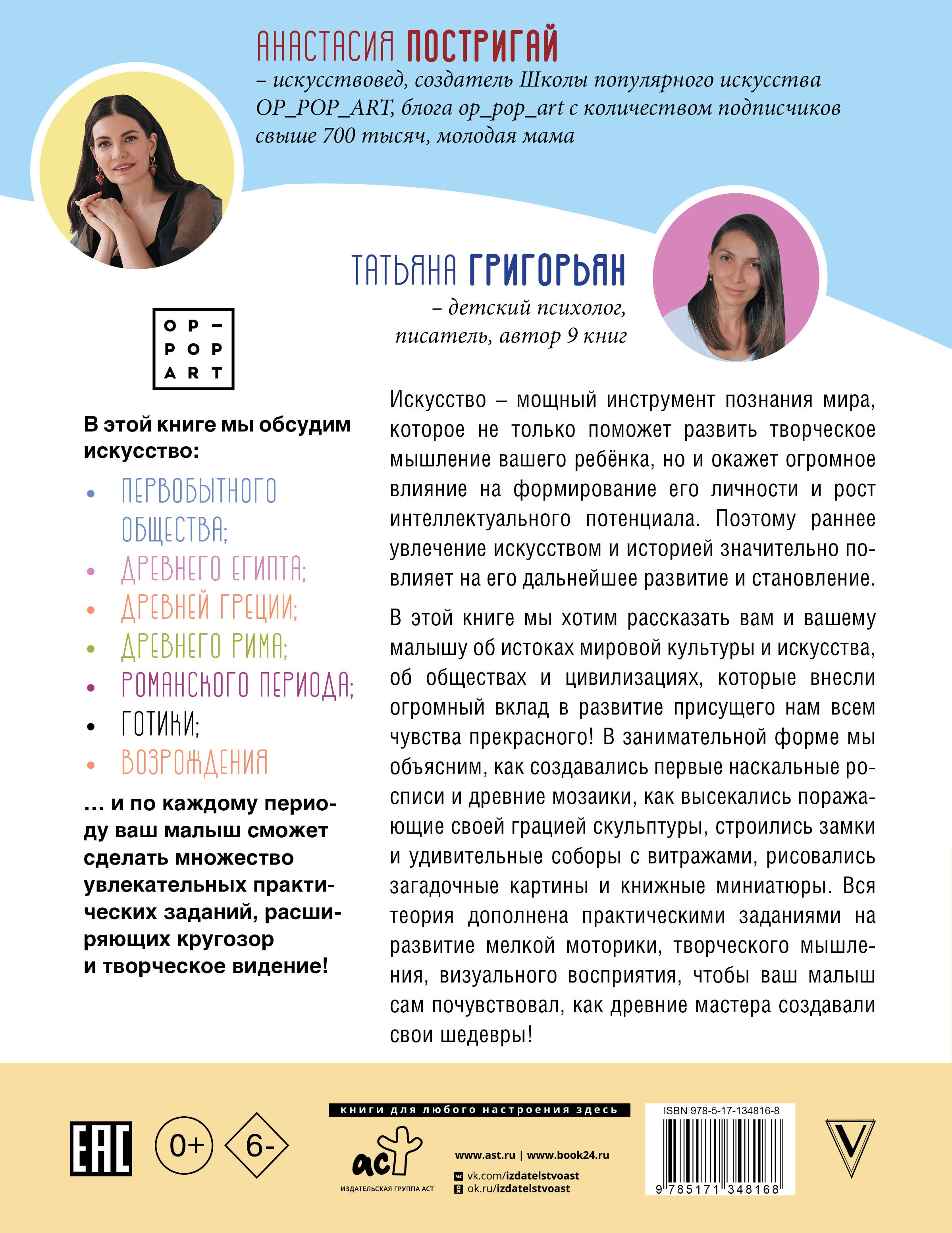 Анастасия Постригай – искусствовед, создатель Школы популярного искусства ОP_POP_ART и блога с количеством подписчиков свыше 700 тысяч, молодая мамаТатьяна Григорьян – детский психолог, писатель, автор книгИскусство – мощный инструмент познания мира, которое не только поможет развить творческое мышление вашего ребёнка, но и окажет огромное влияние на формирование его личности и рост интеллектуального потенциала. Поэтому раннее увлечение искусством и историей значительно повлияет на его дальнейшее развитие и становление.В этой книге мы хотим рассказать вам и вашему малышу об истоках мировой культуры и искусства, об обществах и цивилизациях, которые внесли огромный вклад в развитие присущего нам всем чувства прекрасного! В занимательной форме мы объясним, как создавались первые наскальные росписи и древние мозаики, как высекались поражающие своей грацией скульптуры, строились замки и удивительные соборы с витражами, рисовались загадочные картины и книжные миниатюры. Вся теория дополнена практическими заданиями на развитие мелкой моторики, творческого мышления, визуального восприятия, чтобы ваш малыш сам почувствовал, как древние мастера создавали свои шедевры!В этой книге мы обсудим искусство:– первобытного общества;– Древнего Египта;– Древней Греции;– Древнего Рима;– романского периода;– готики;– Возрождения… и по каждому периоду ваш малыш сможет сделать множество увлекательных практических заданий, расширяющих кругозор и творческое видение!