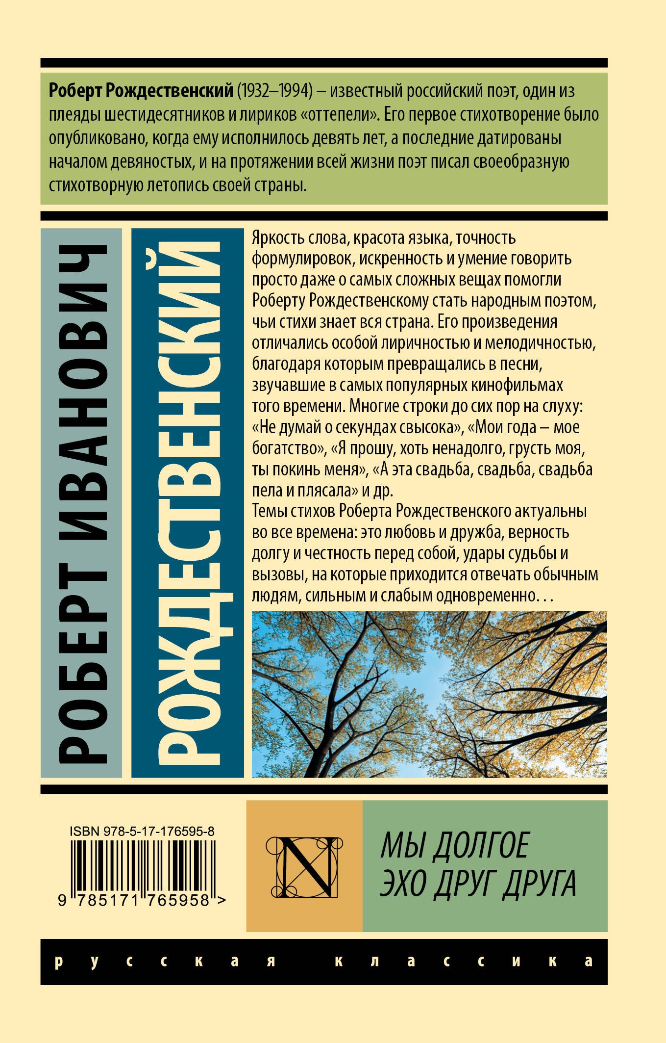 — Сборник избранных стихотворений Роберта Рождественского. В этой книге вы найдете такие произведения, как «Не думай о секундах свысока», «Мои года — мое богатство», «Песня о далекой Родине», «Свадьба» и многие другие.— Роберт Рождественский — известный советский поэт, один из самых ярких представителей эпохи шестидесятников.— Стихи Рождественского отличаются эмоциональностью, образностью и ритмичностью — не случайно многие из них стали песнями.— Издание в серии «Эксклюзив: Русская классика» — в узнаваемом оформлении и удобном карманном формате.