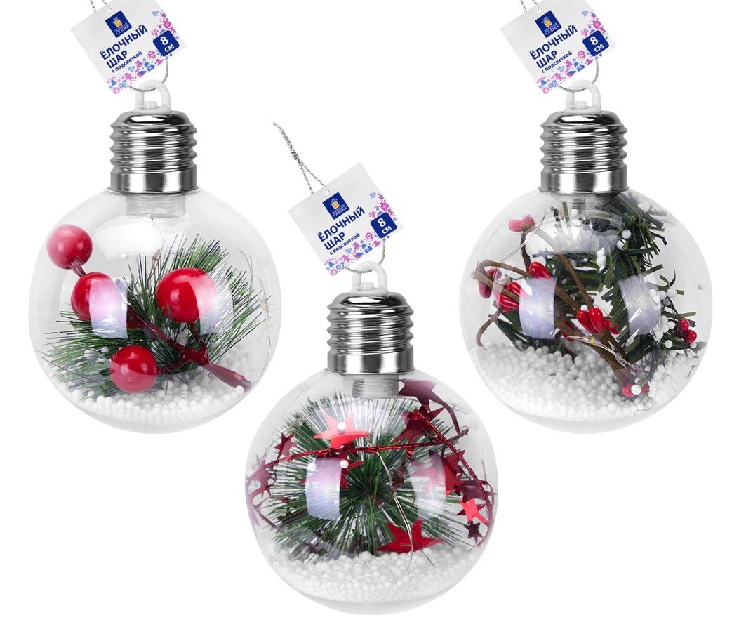 Шары представлены с наполнением в 3 дизайнах. Диаметр – 8 см. Внутри шаров находится светодиод. Работают от 3 кнопочных батареек "таблеток" типа LR44 в колпачке-подвесе (входят в комплект), включаются/отключаются нажатием сверху. Батарейки можно заменить, открутив колпачок. В верхней части металлического колпачка находится пластиковый крючок, через который продевается веревочка.