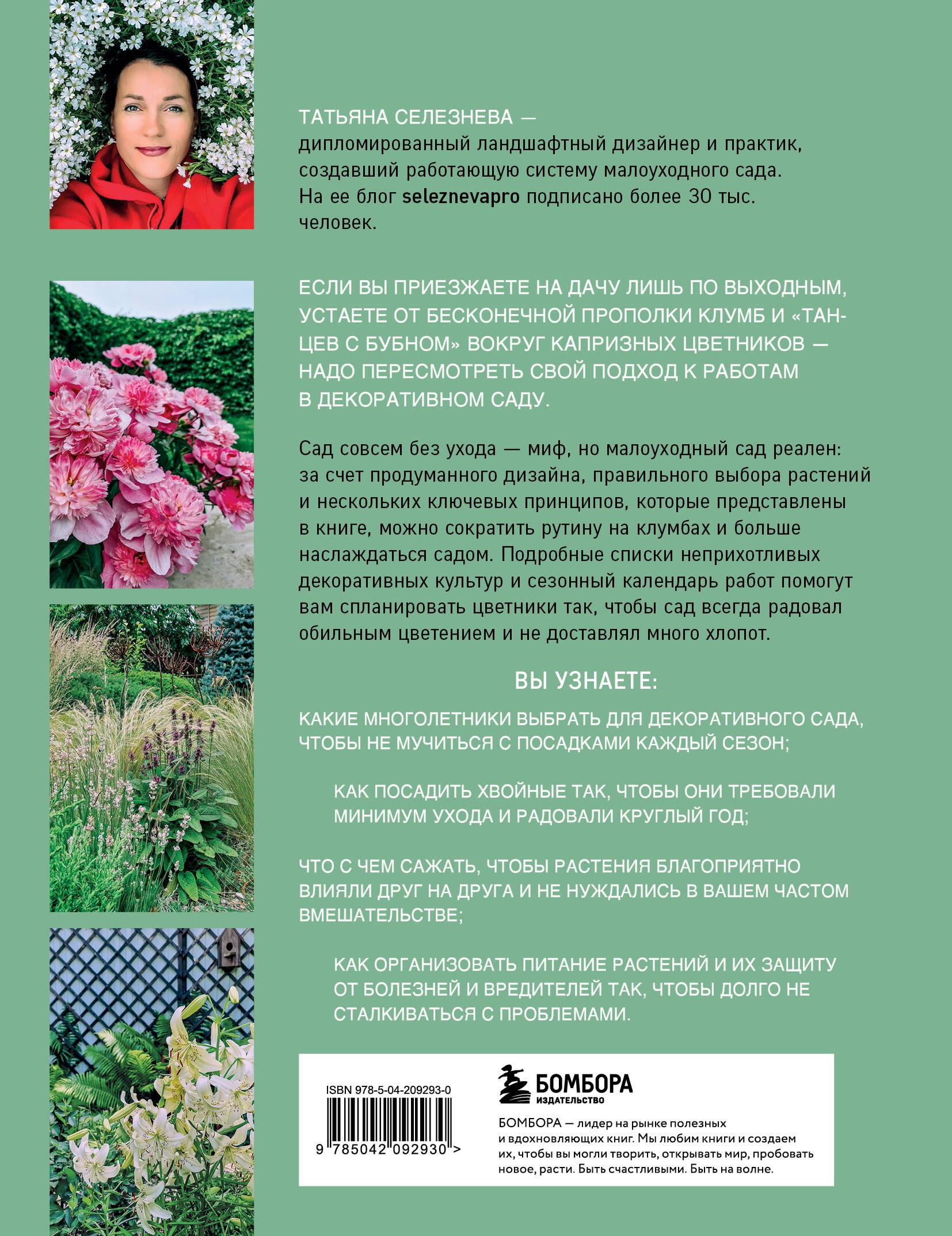Декоративный сад совсем без ухода — миф, а вот малоуходный сад — реальность: за счёт продуманного дизайна, правильного выбора растений и нескольких ключевых принципов можно сократить рутину на клумбах и больше наслаждаться садом.Если вы наведываетесь на дачу лишь по выходным и устали от бесконечной прополки и «танцев с бубном» вокруг капризных цветников, то эта книга для вас! Она станет вашим простым и понятным планом действий. Подробные списки неприхотливых декоративных культур и сезонный календарь работ помогут вам спланировать цветники так, чтобы сад всегда радовал обильным цветением и не доставлял много хлопот.Вы узнаете:- какие многолетники выбрать для декоративного сада, чтобы не мучиться с посадками каждый сезон;- как посадить хвойные так, чтобы они требовали минимум ухода и радовали круглый год;- что с чем сажать, чтобы растения благоприятно влияли друг на друга и не нуждались в вашем частом вмешательстве;- как организовать питание растений и их защиту от болезней и вредителей так, чтобы долго не сталкиваться с проблемами.Автор — Татьяна Селезнёва, дипломированный ландшафтный дизайнер и практик, создавший работающую систему малоуходного сада. В соцсетях более 30 тыс. подписчиков.
