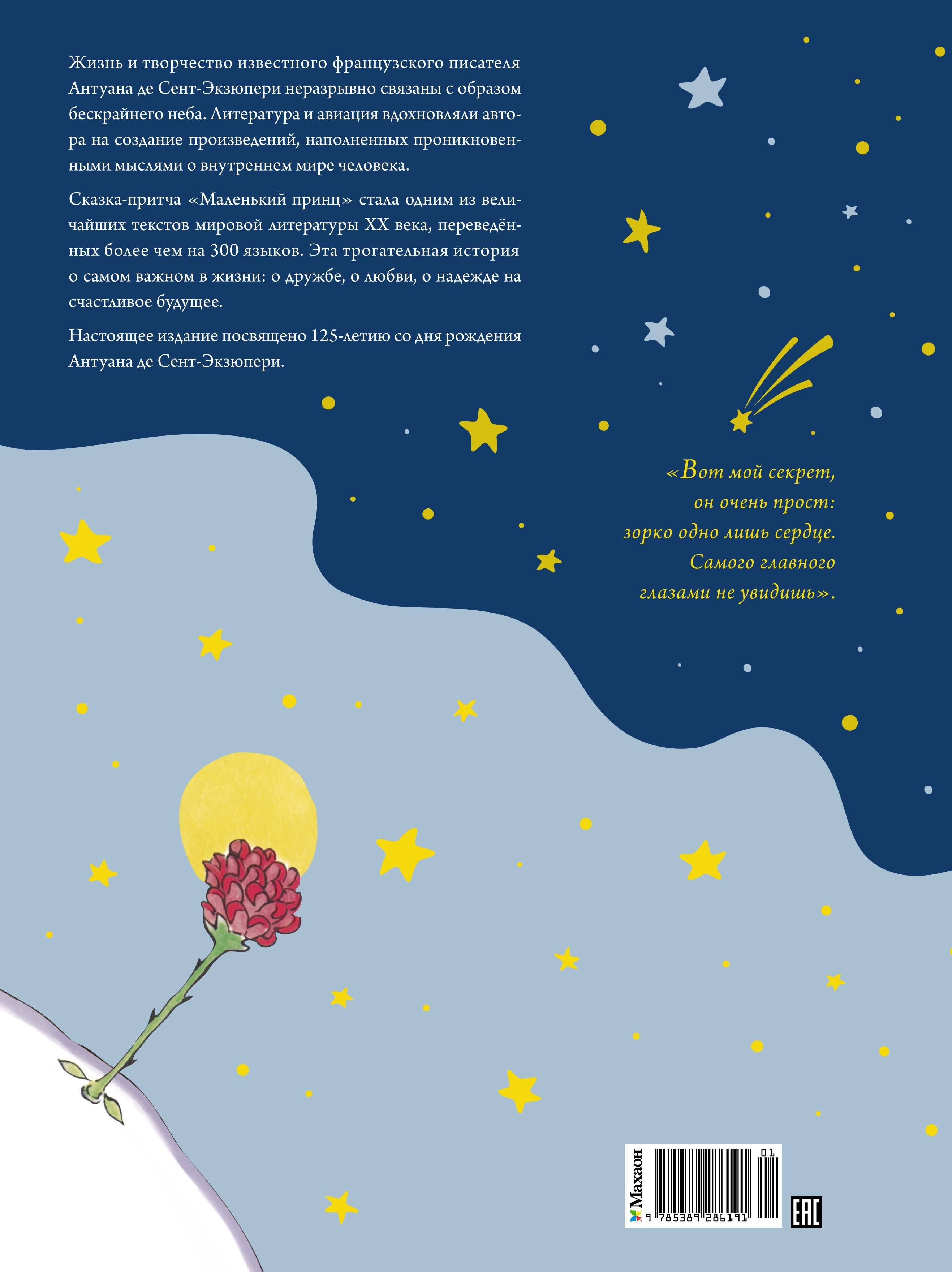 Подарочное издание книги "Маленький принц" приурочено к юбилею известного французского писателя Антуана де Сент-Экзюпери. Впервые издание в переводе Норы Галь и с иллюстрациями автора издаётся с уникальным оформлением: большой подарочный формат, плотные страницы мелованной бумаги, а также обложка, украшенная двумя видами фольги и сахарной плёнкой.Эта книга станет идеальным подарком ценителям творчества писателя и отлично украсит домашнюю коллекцию. Любимое детское произведение можно сделать подарком для мальчиков и девочек к Новому году.Жизнь и творчество известного французского писателя Антуана де Сент-Экзюпери неразрывно связаны с образом бескрайнего неба. Литература и авиация вдохновляли автора на создание произведений, наполненных проникновенными мыслями о внутреннем мире человека. Сказка-притча «Маленький принц» стала одним из величайших текстов мировой литературы ХХ века, переведённых более чем на 300 языков. Эта трогательная история о самом важном в жизни: о дружбе, о любви, о надежде на счастливое будущее.Настоящее издание посвящено 125-летию со дня рождения Антуана де Сент-Экзюпери.