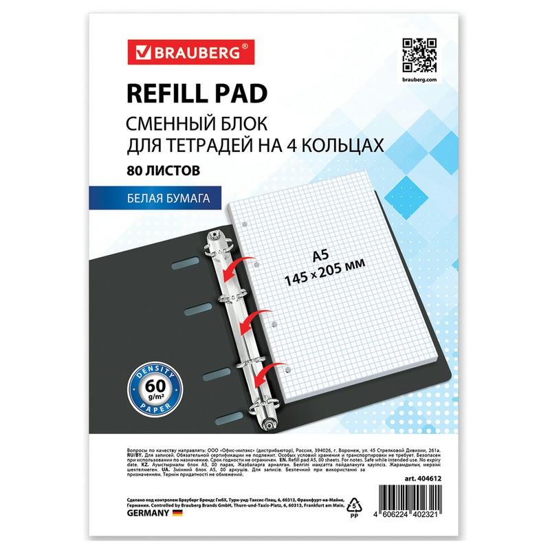 Сменный блок подходит для всех тетрадей на 4 кольцах формата А5. Внутренний блок содержит 80 листов белой офсетной бумаги плотностью 60 г/м2. Линовка – клетка без полей. Упакован в термопленку.