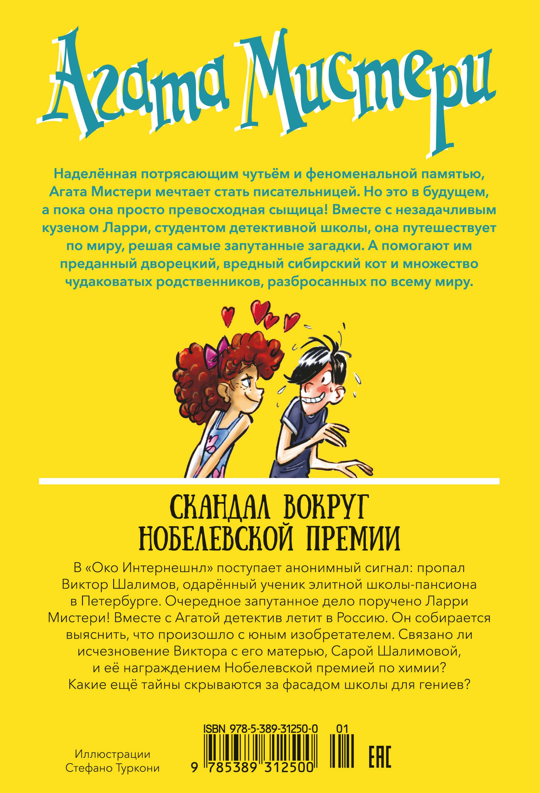 Знаменитая девочка-детектив Агата Мистери расследовала больше трех десятков преступлений по всему миру и вот, наконец, едет в Россию! В 33-й книге «Скандал вокруг Нобелевской премии» Ларри Мистери, незадачливый студент престижной школы детективов, вместе с Агатой, мистером Кентом и вредным котом Ватсоном отправляются в блистательный Санкт-Петербург — город дворцов, каналов и неразгаданных тайн!Из элитной петербургской школы для одаренных подростков «Школа гениев» неожиданно исчезает юный изобретатель Виктор Шалимов. Дело кажется неразрешимым, но за него берутся Агата и Ларри Мистери.Детективам предстоит расшифровать закодированное послание, спрятанное в матрешках, выяснить, кто скрывается под псевдонимом Дед Мороз, и понять, кто плетет интриги вокруг премии и какую роль в скандале играет мать Виктора Сара, номинированная на Нобелевскую премию по химии.Книга с любовью и юмором проиллюстрирована Стефано Туркони – талантливым художником, сотрудничающим со студией «Уолт Дисней. Италия».«Скандал вокруг Нобелевской премии» — это история о дружбе, смелости и расследовании, которая будет держать в напряжении до последней страницы.